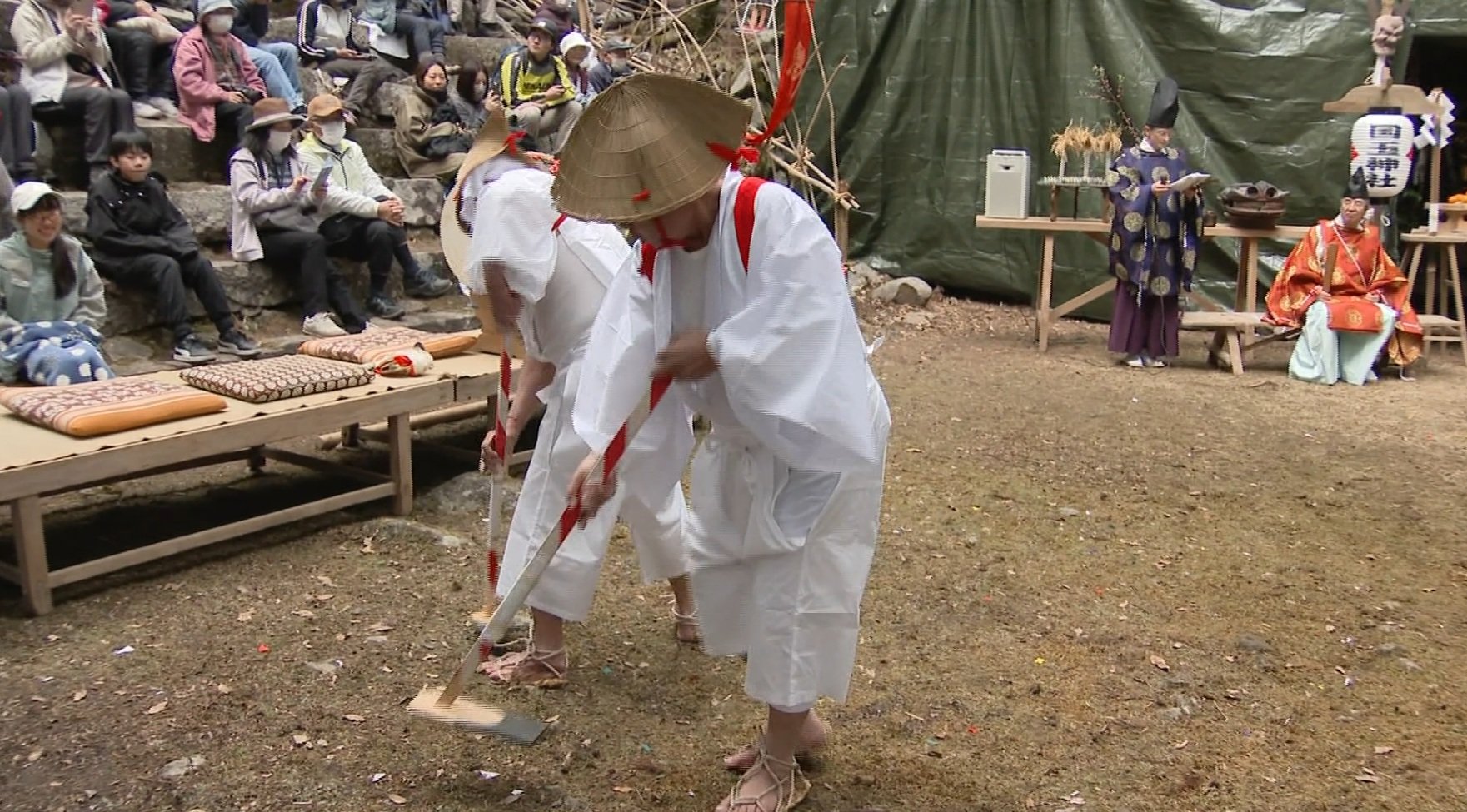 その求菩提山で、旧豊前国に春を告げる「お田植祭」が3月29日(土)に執り行われました。春に田んぼのあぜを作り、秋の豊かな収穫に感謝するまでの一連の所作を演じ、あらかじめ秋の五穀豊穣を願う、福岡県指定の無形民俗文化財です。
