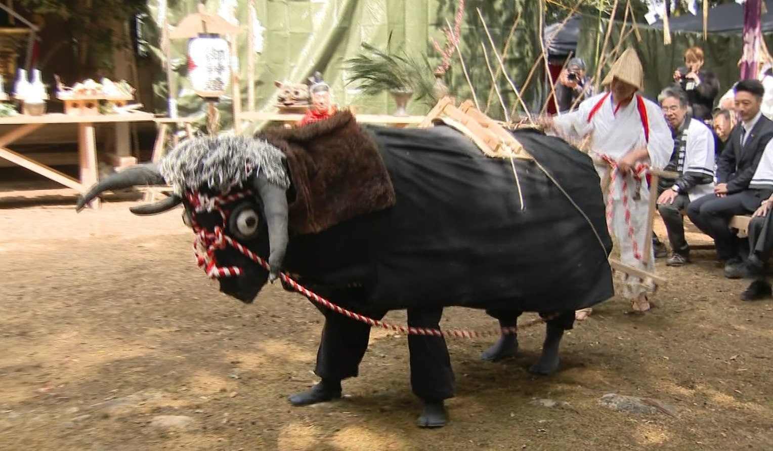 張りぼてに男性2人が入っていて、モーモー鳴いています。牛を使って田んぼを平らに整える「代かき」です。