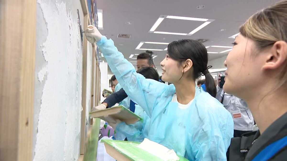 こちらは左官職人の体験ブース。コテを使って壁を塗り上げる作業に挑戦です。