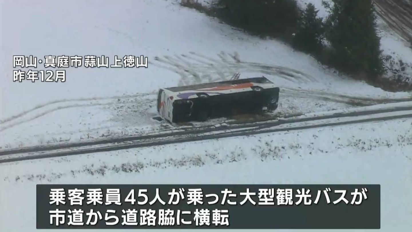 この事故は去年12月、真庭市蒜山上徳山の市道で乗客・乗員45人が乗った観光バスがスリップし、道路脇に横転。男女11人が重軽傷を負ったものです。