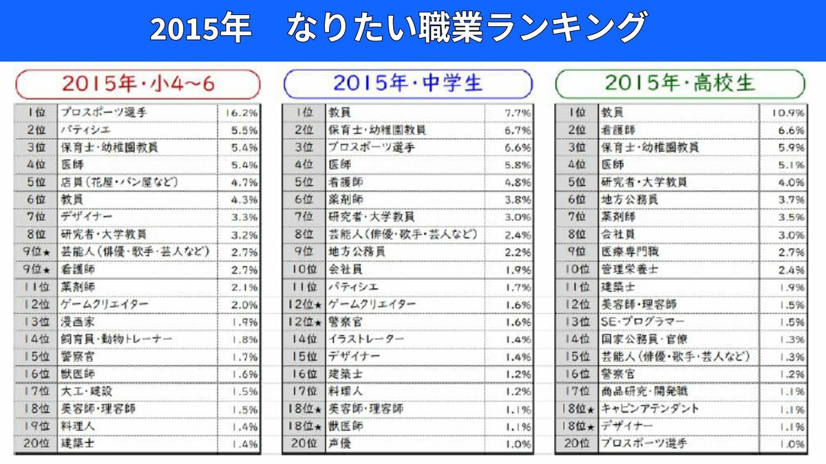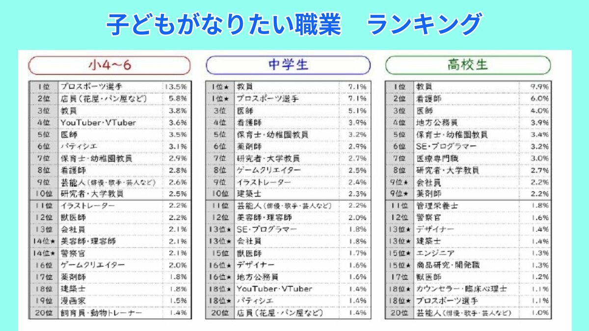 子どもたちがなりたい職業、、、1位は、