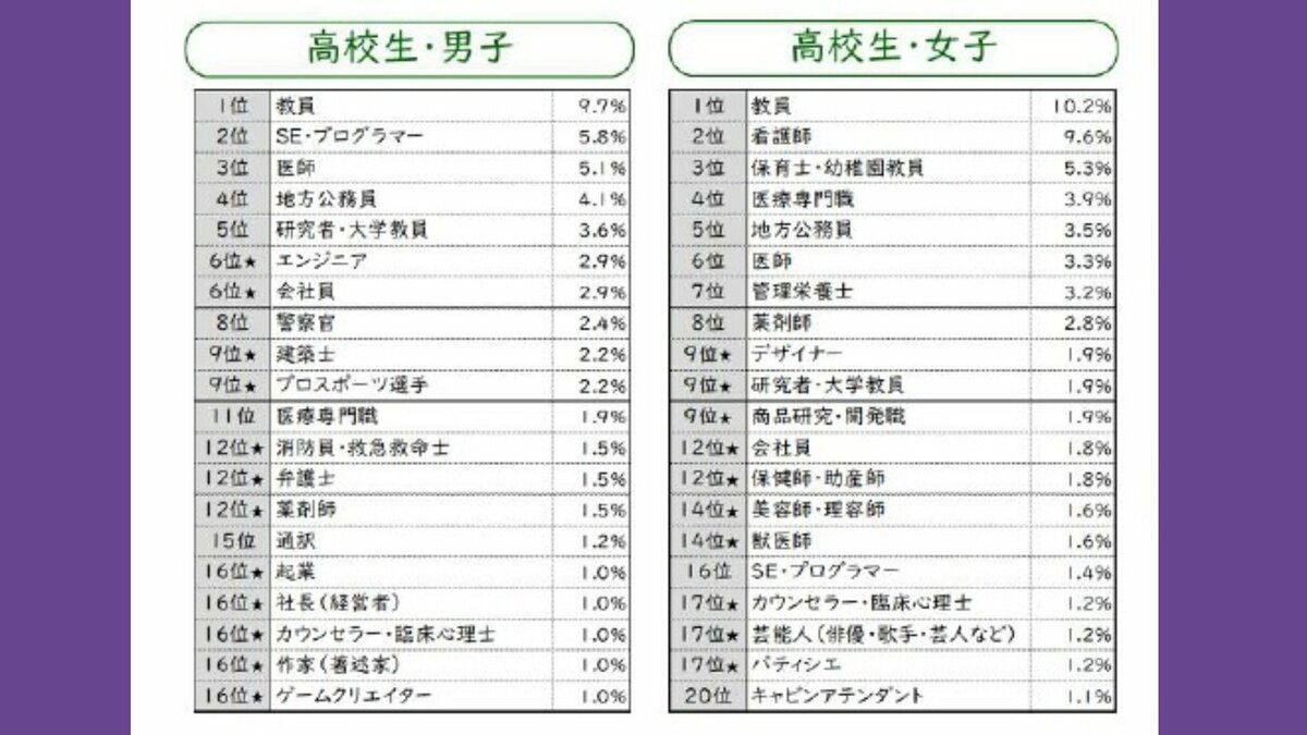 「男女別」「世代別」なりたい職業は?