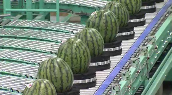 検査員がキズがないかなどを確認した後、センサーで糖度や重さを計測されたスイカは箱詰めのラインへ流れていきます。