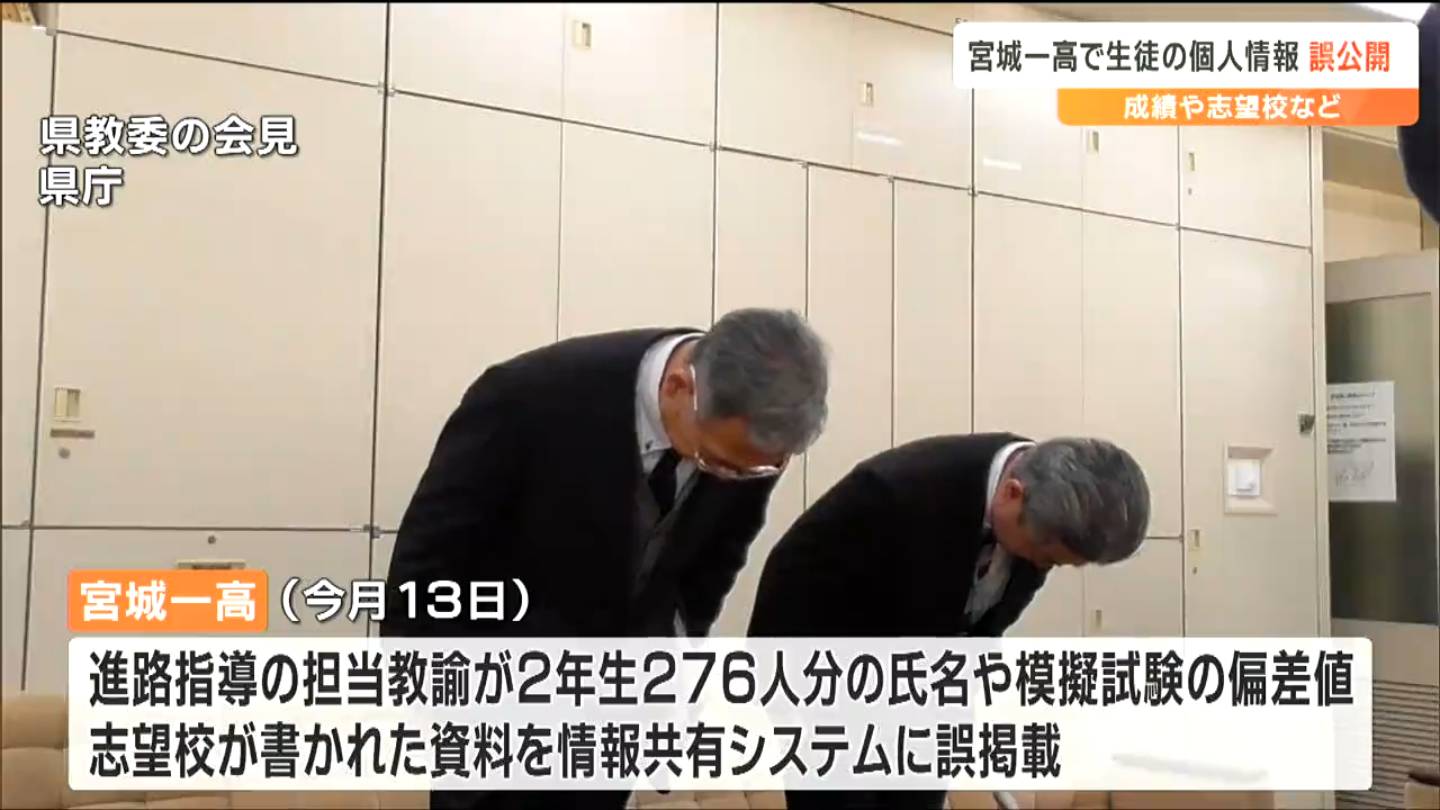 12月13日、仙台市にある宮城第一高校の教諭が生徒の成績や志望校などの個人情報が記載された資料を、誤って校内の情報共有システムに掲載し、複数の生徒が閲覧していたことがわかりました。
