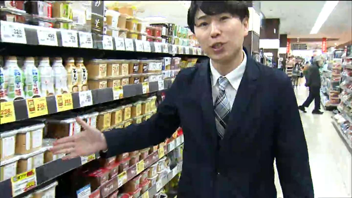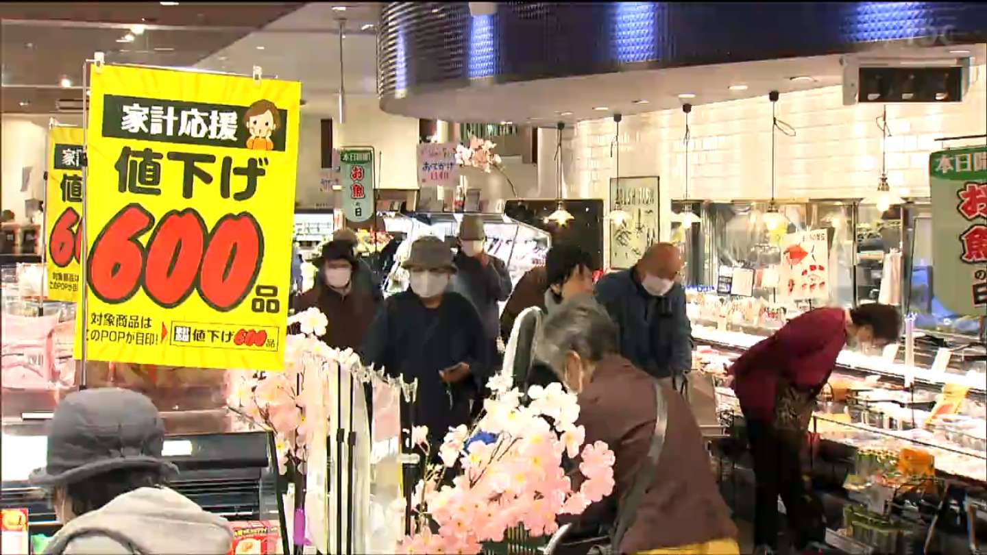 「きょうから始まった値下げのセール。かつおだしや味噌など日常生活に欠かせない食料品などが値下げされています。家計応援値下げ600品、このマークが目印です」