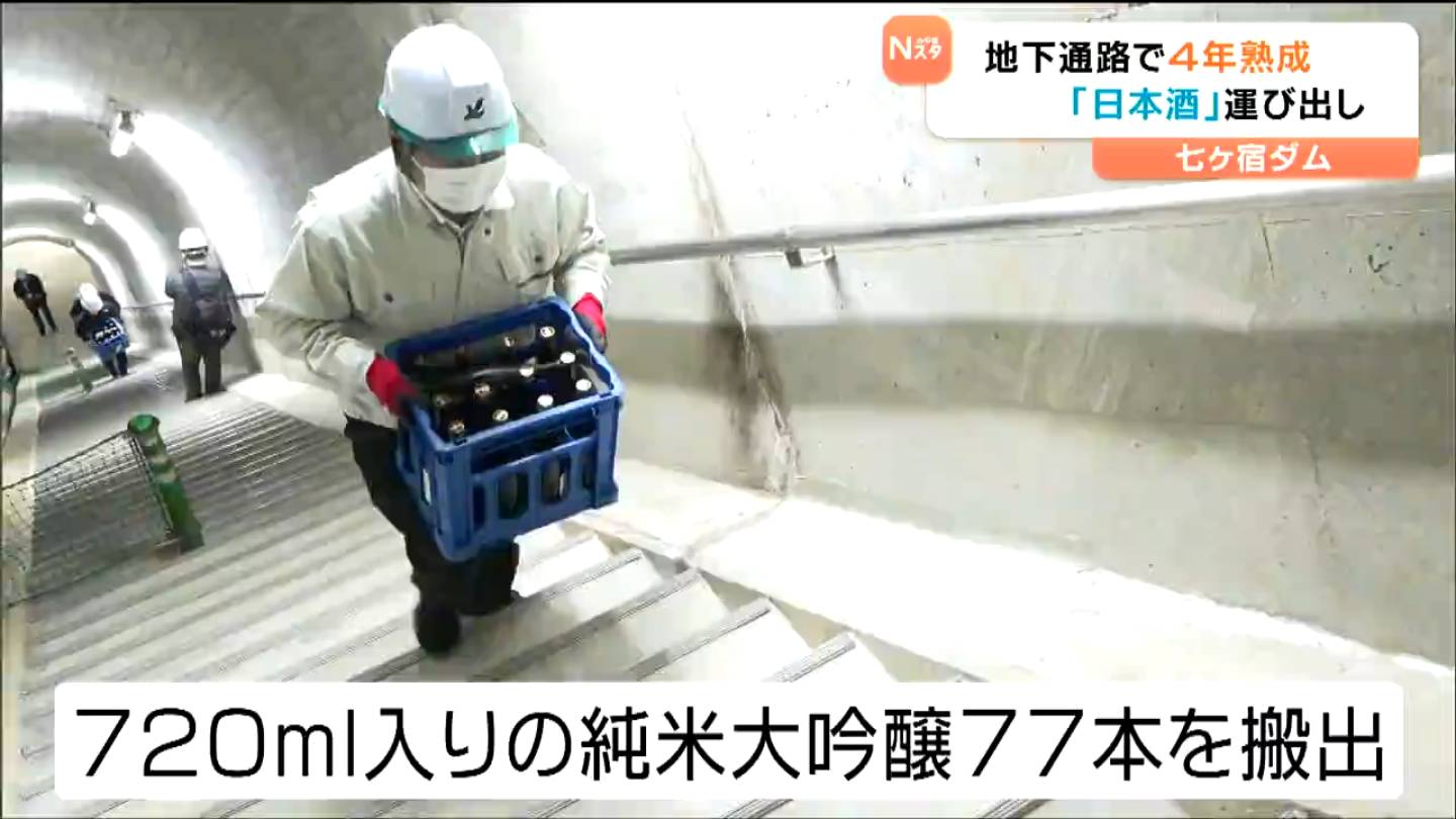 温度が一定に保たれているダムの地下で熟成させました。宮城県の七ヶ宿ダムの地下通路で4年間貯蔵されていた日本酒が、14日に運び出されました。