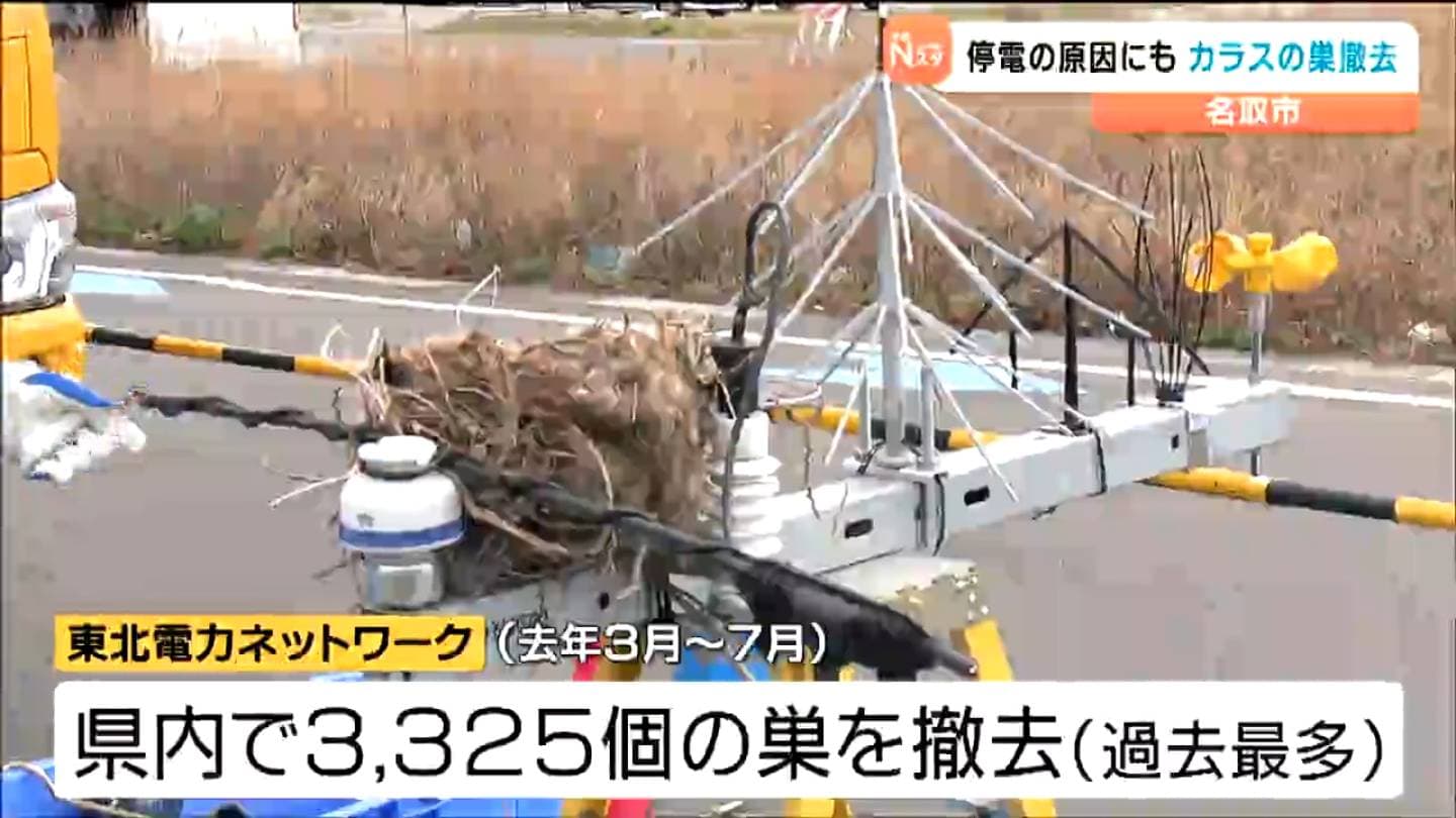 カラスは繁殖期となる3月から7月までに盛んに巣を作るということで、東北電力ネットワークは、去年のこの時期に県内で過去最多となる3325個の巣を撤去しました。また、県内では今年に入り14日までにカラスの巣が原因となった停電が3件発生しています。東北電力ネットワークは引き続きパトロールを強化し撤去作業を続けることにしています。