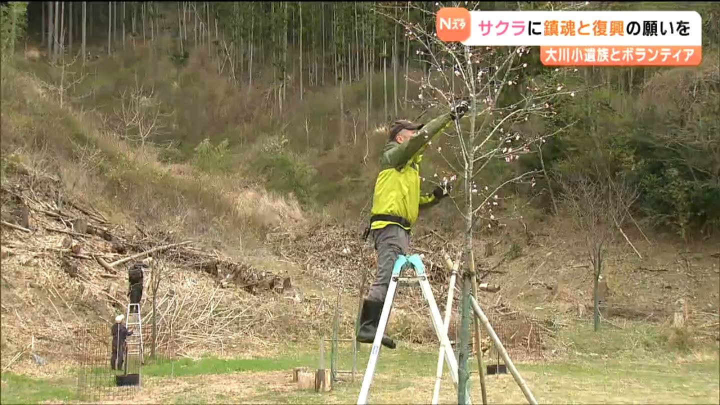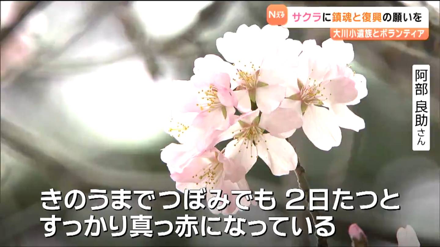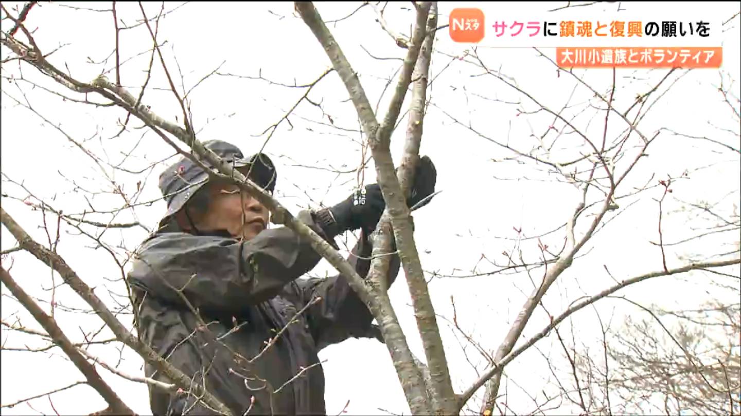 東日本大震災の津波で、児童74人と教職員10人が犠牲になった宮城県石巻市の大川小学校。その近くで、鎮魂と復興の願いを込めて植えられたサクラが今年も花を咲かせました。週末、植樹をした遺族とボランティアが、せん定作業を行うとともに久しぶりの交流を楽しみました。