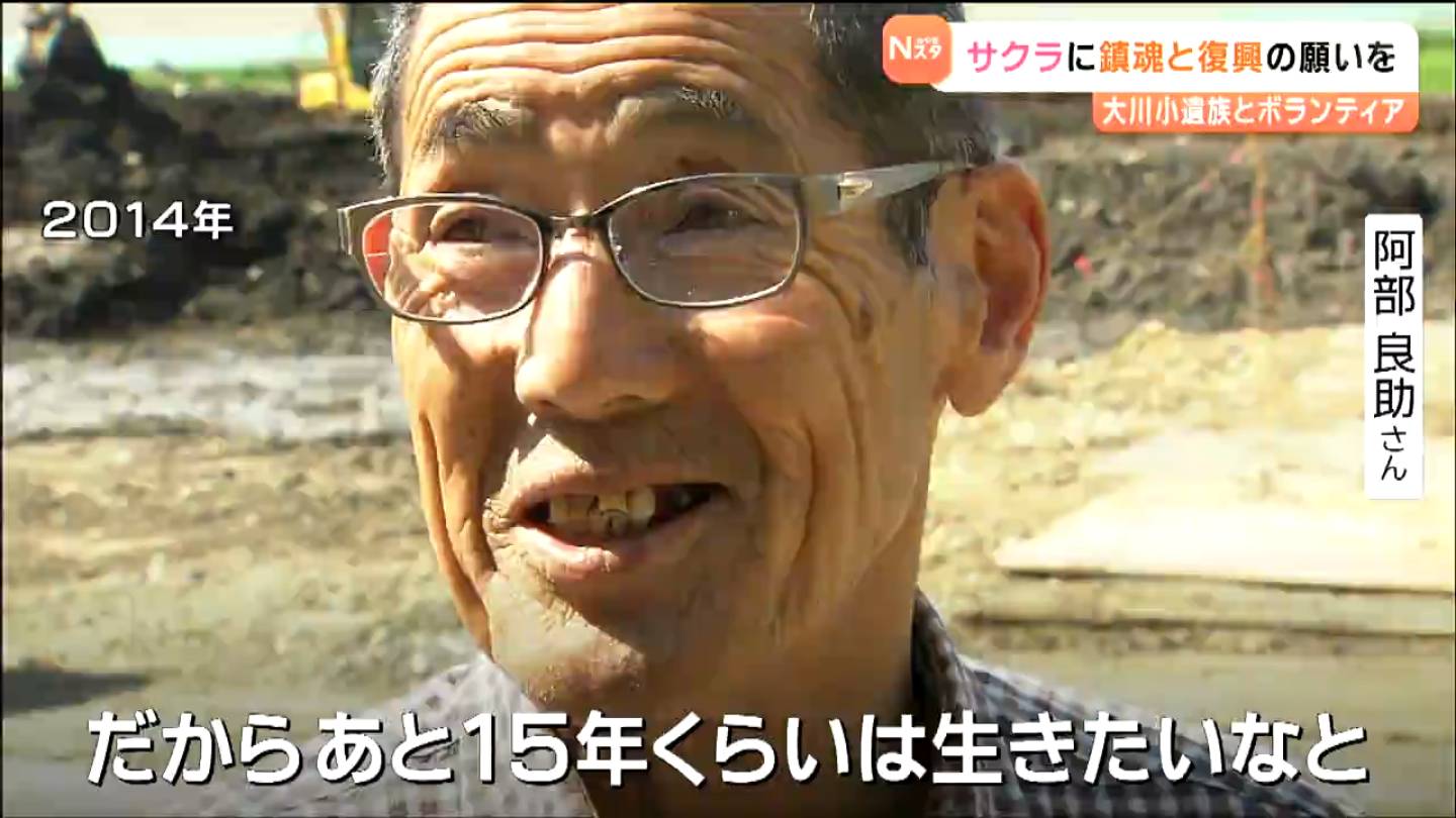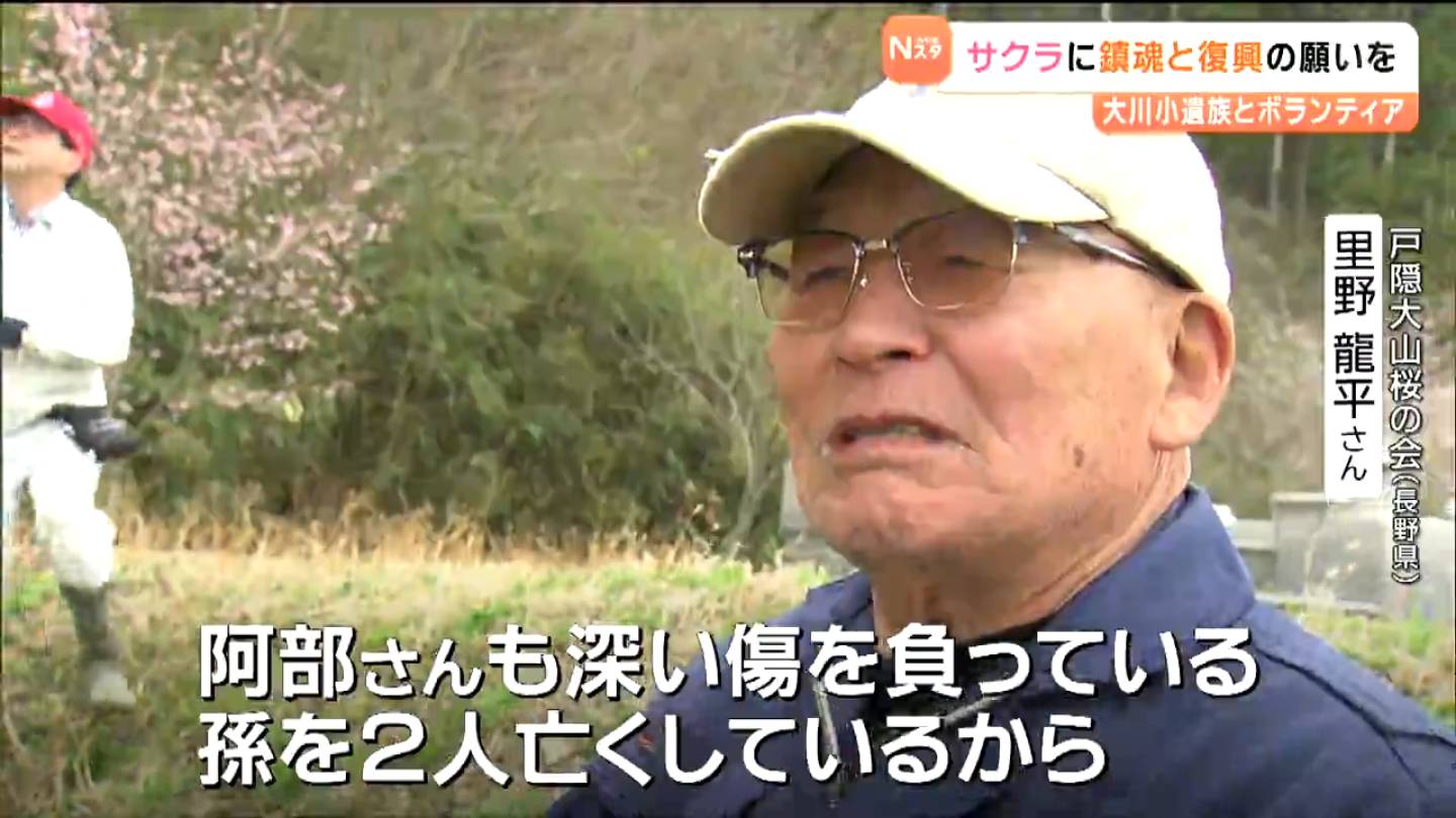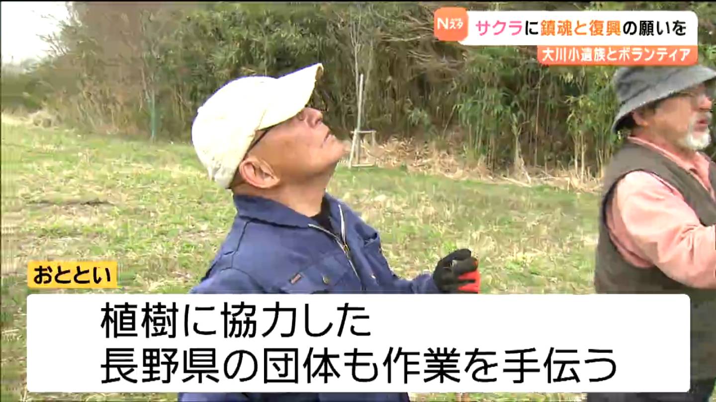 阿部さんは、震災が起きた2011年の秋から長野県の団体の協力を得て、鎮魂と復興の願いを込めてサクラの植樹を続けてきました。阿部さんは、地域住民らとともに、東日本大震災で犠牲になった地区住民と同じ数の269本を目標に植樹を始め、これまでにおよそ300本を植えました。
