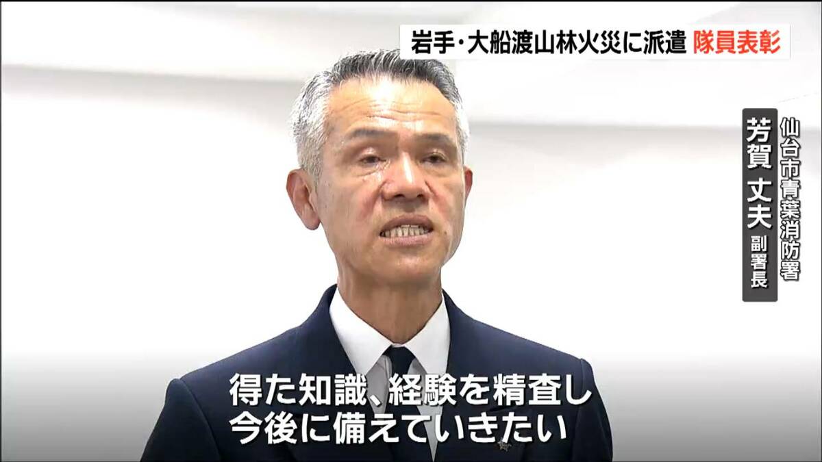 仙台市役所には14日、大船渡市の山林火災に派遣されていた仙台市消防局の隊員ら7人が訪れ、代表して仙台市青葉消防署の芳賀丈夫副署長に表彰状が手渡されました。