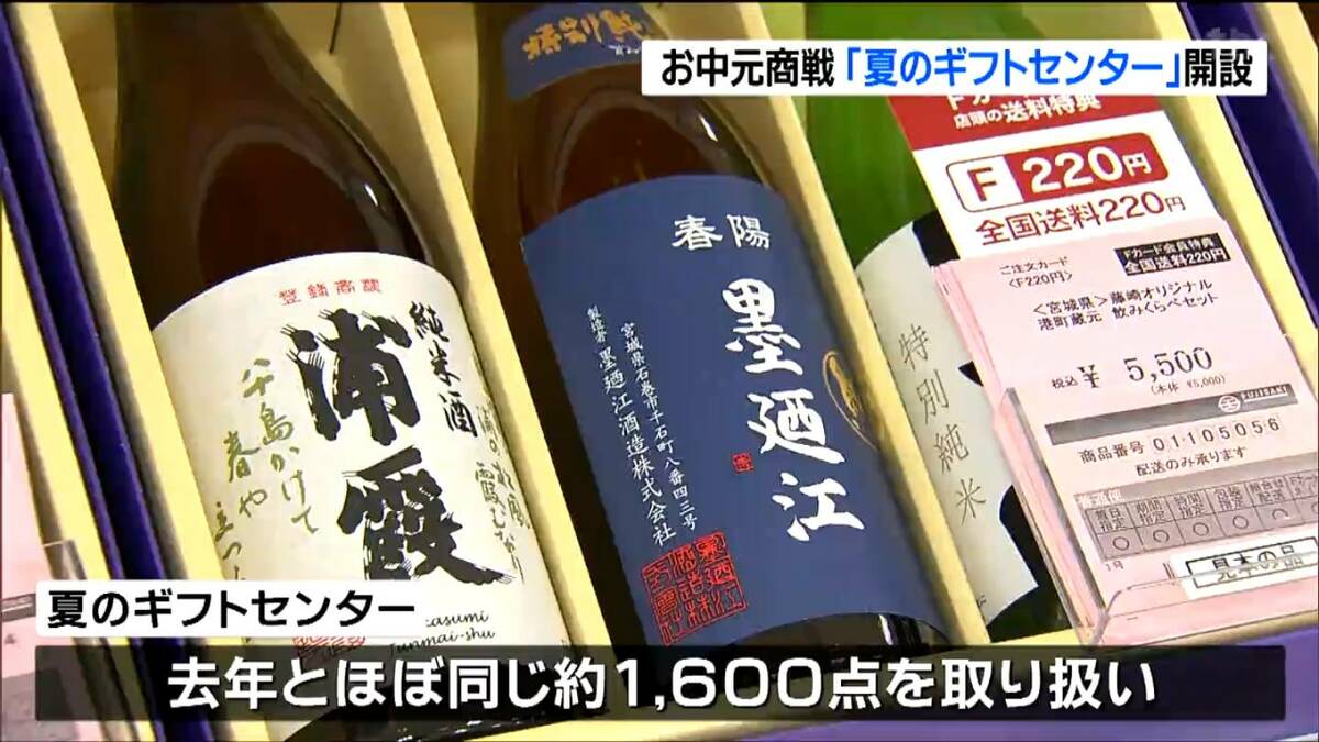 仙台市青葉区の藤崎で12日にオープンした「夏のギフトセンター」。牛タンや笹かまぼこなどの定番商品から、ビールや宮城の銘菓など、2024年とほぼ同じ数の約1600点を取り扱っています。