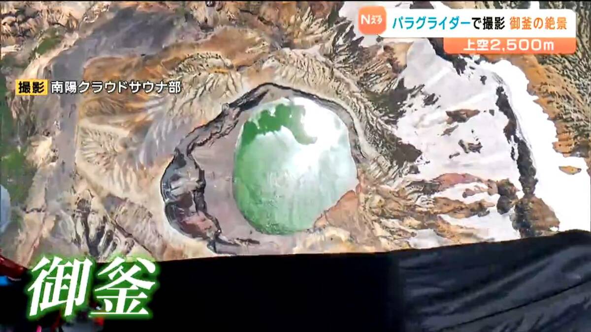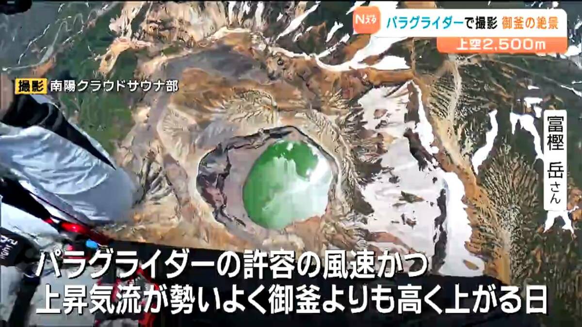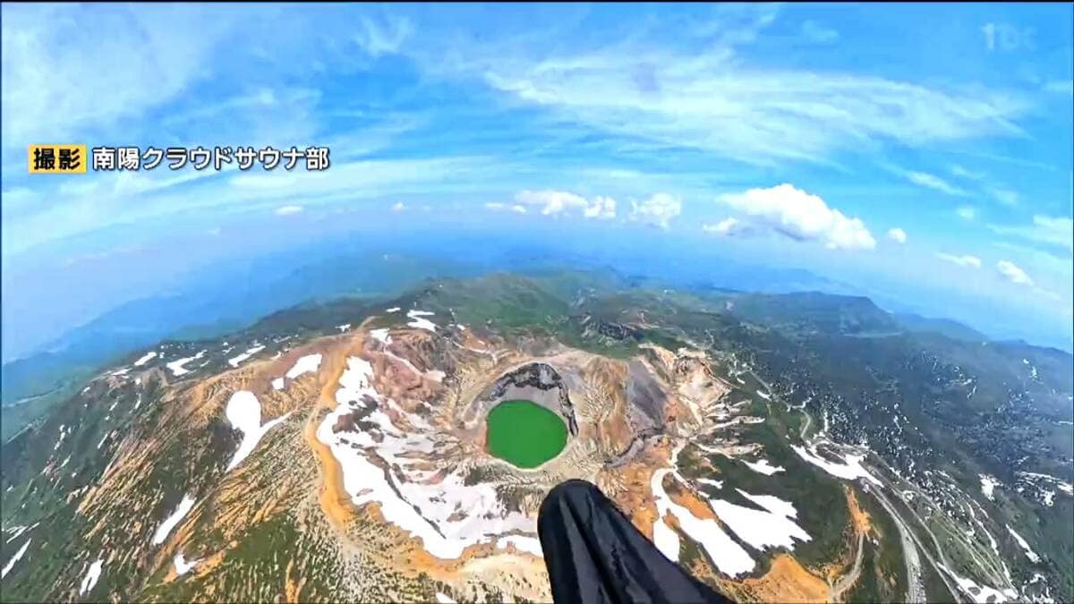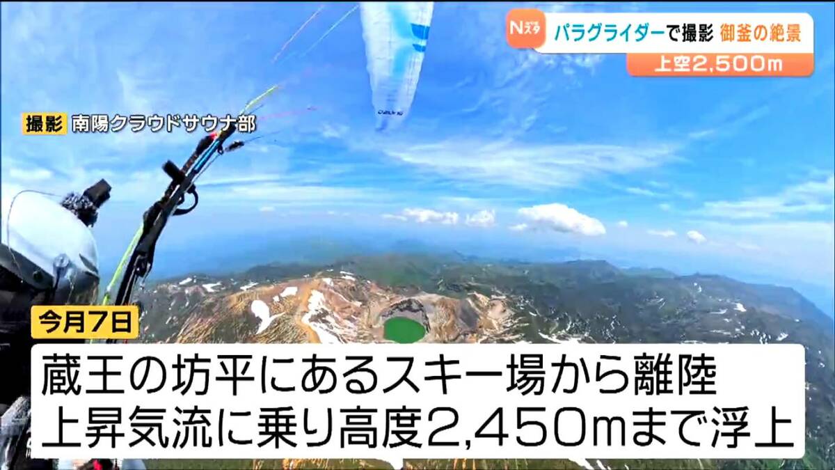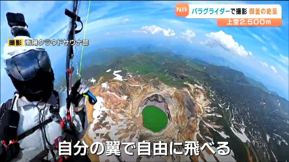 6月に仙台市の会社員の男性が、パラグライダーで上空約2500メートルから蔵王の御釜を撮影しました。映像には、地上や航空機からでは見ることのできない絶景が広がっていました。