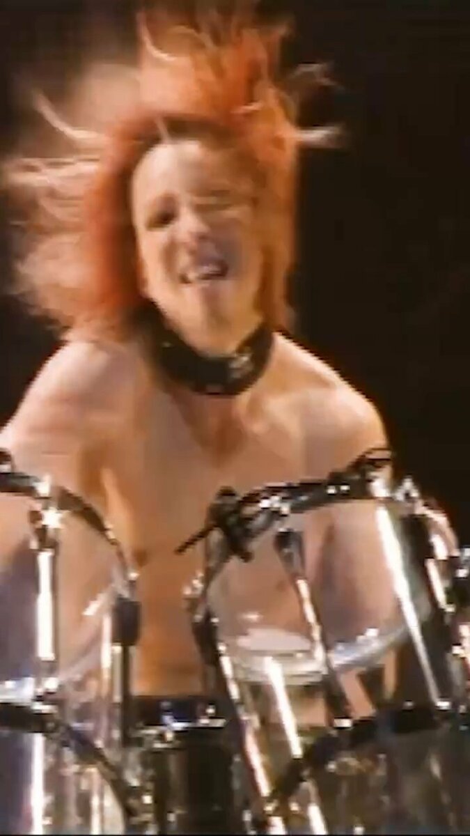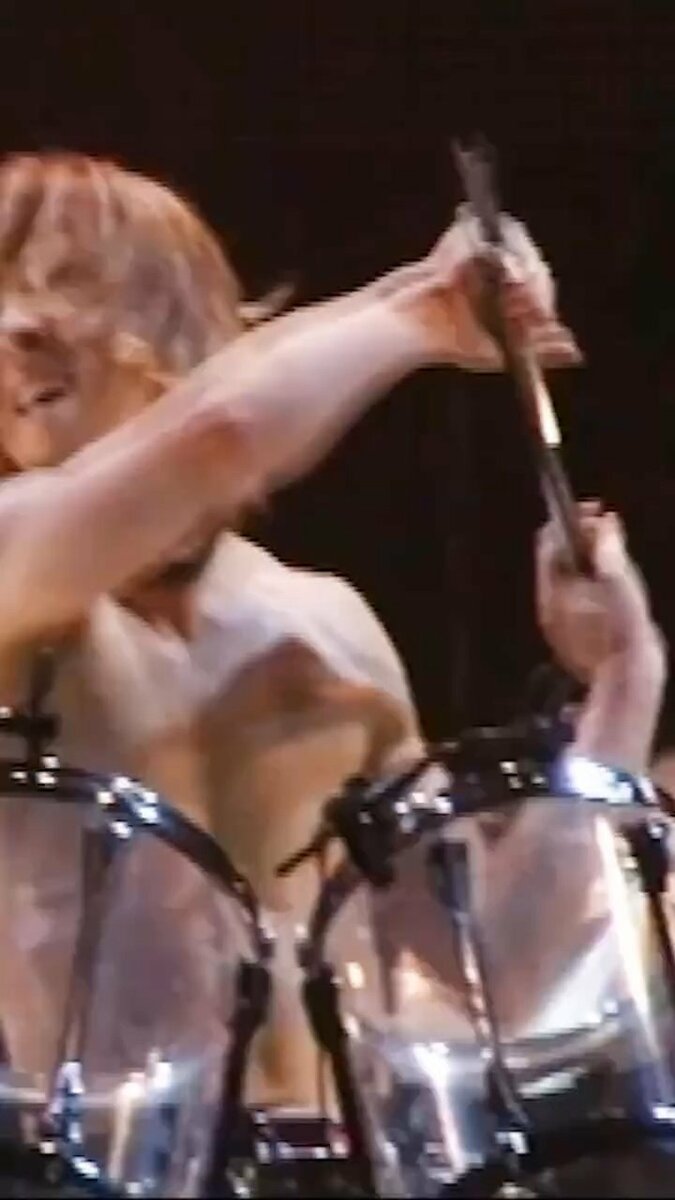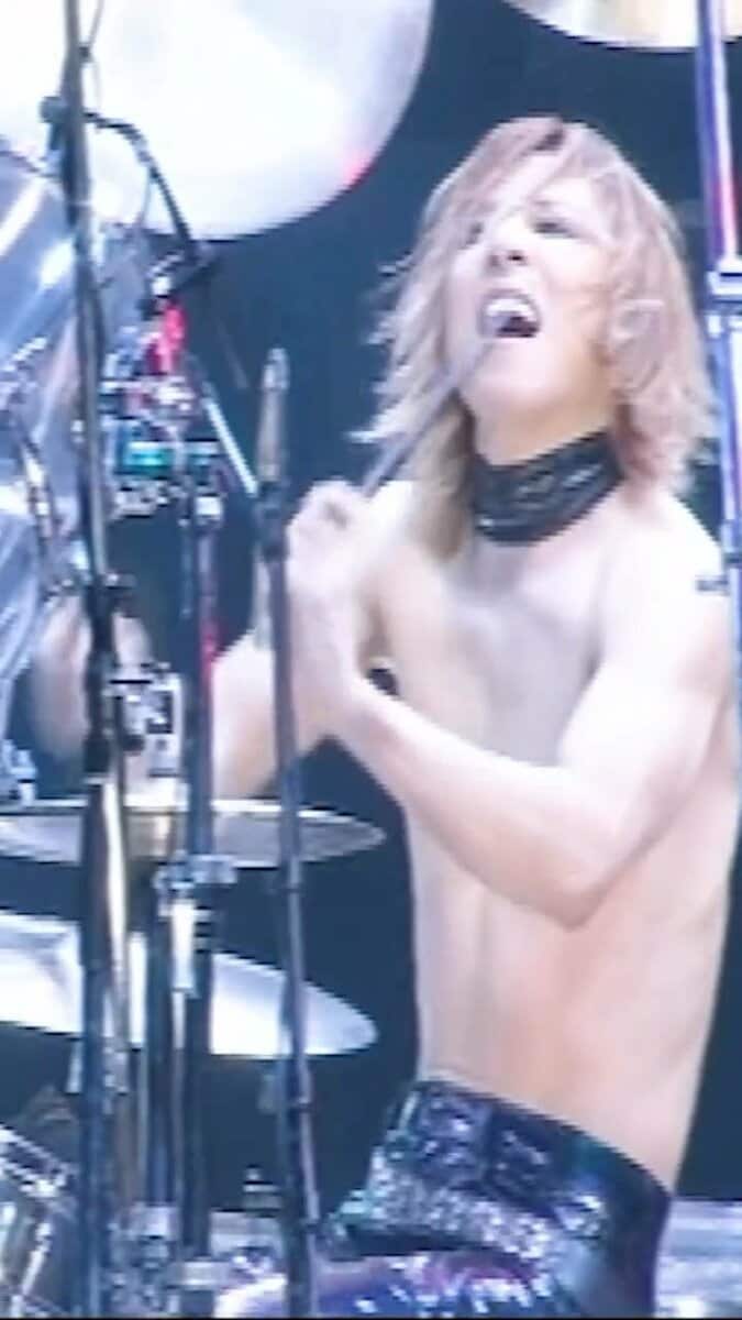YOSHIKIさんは “I also use my cymbal as a drum stick.. sometimes!” 「思いつきでドラムスティックの代わりにシンバルを使ってみた」と、お茶目な顔文字と共にテキスト。動画を見てみると、上半身裸のYOSHIKIさんが大ステージの真ん中のドラムセットで激しいソロを演奏中、左側のシンバルスタンドを投げ飛ばしたり、右側のスタンドからシンバルを引き抜いて、まるで丸太を割る斧のようにドラムセットを激しく何度も殴打しています。