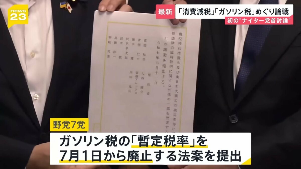 また、高止まりが続くガソリン価格対策として11日、立憲など野党7党は、ガソリン税の「暫定税率」を7月1日から廃止する法案を提出。実施された場合、約15円ほどガソリン価格が下がるとみられていて、11日の討論でも議題になりました。