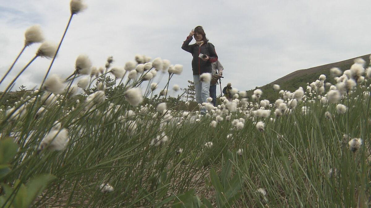 標高およそ1600メートルにある吾妻山の浄土平。こちらの湿原では、高山植物のワタスゲが見頃を迎えていて、一面に白い絨毯が広がっています。今年は去年よりも少し開花が遅れ、10日ほど前から咲き始めました。訪れた人たちは、ひんやりとした空気の中、風に揺れるワタスゲを眺めたり、写真に収めたりして楽しんでいました。