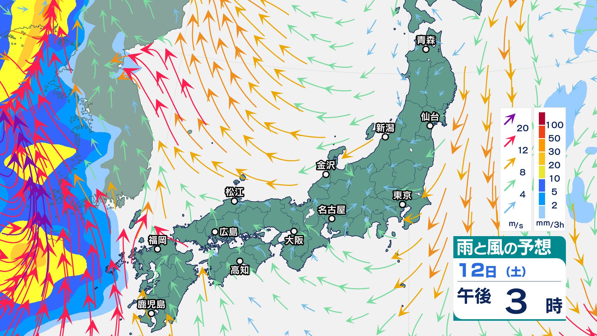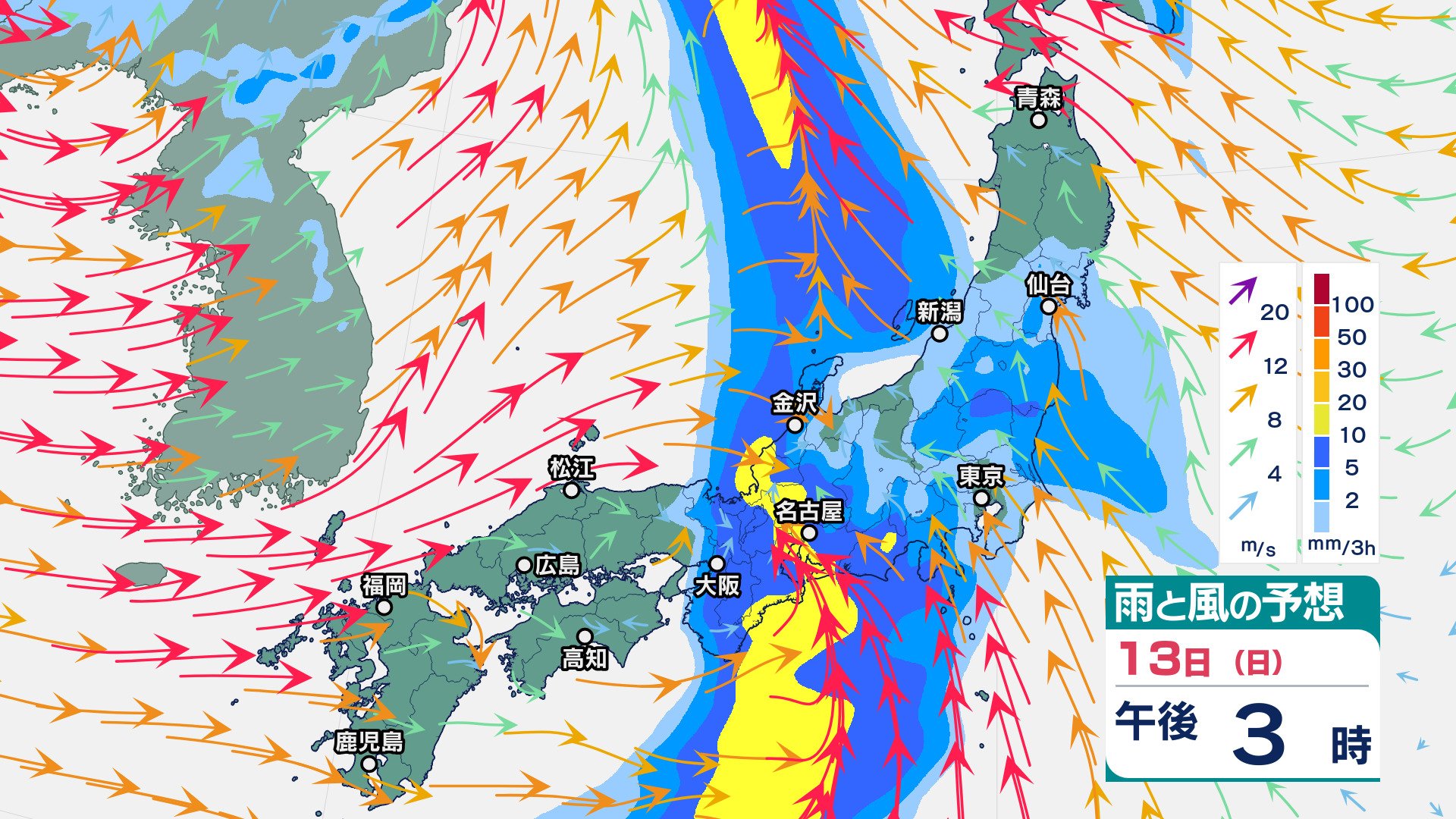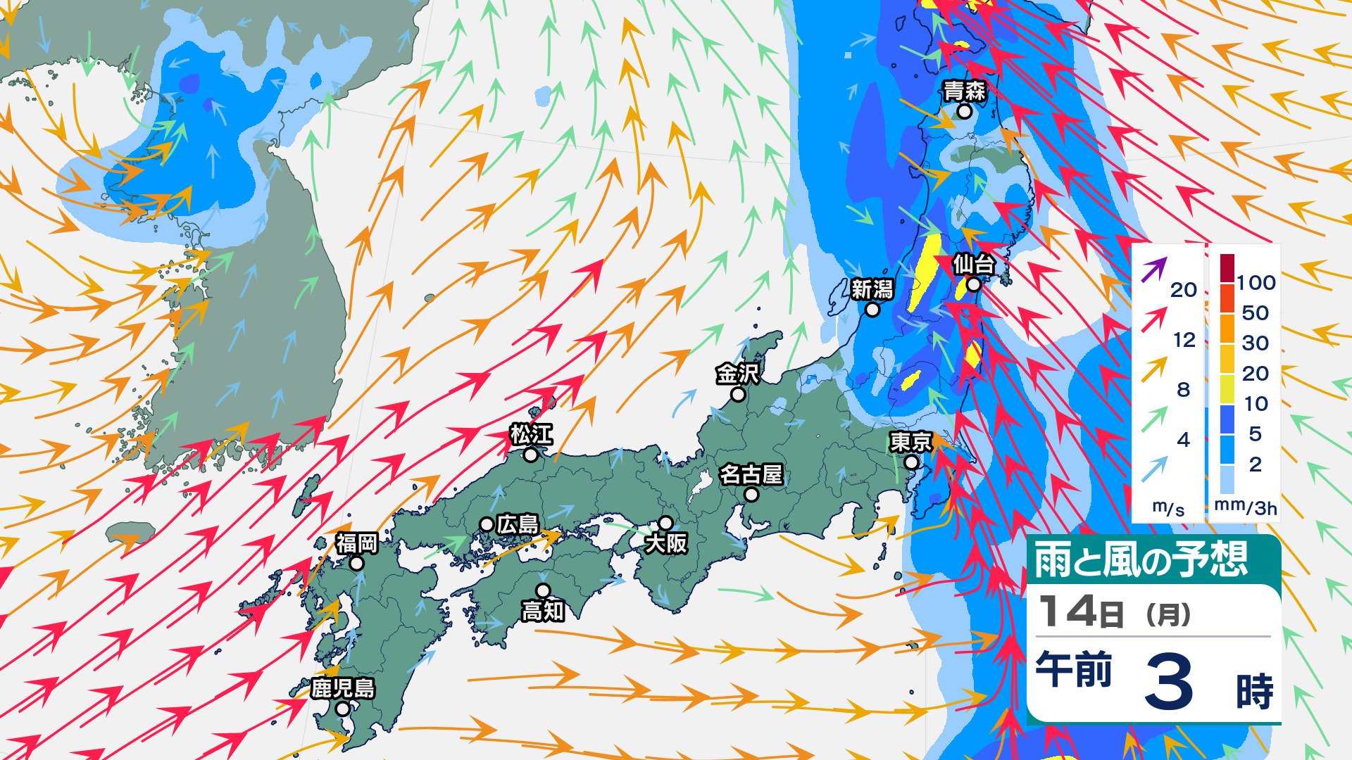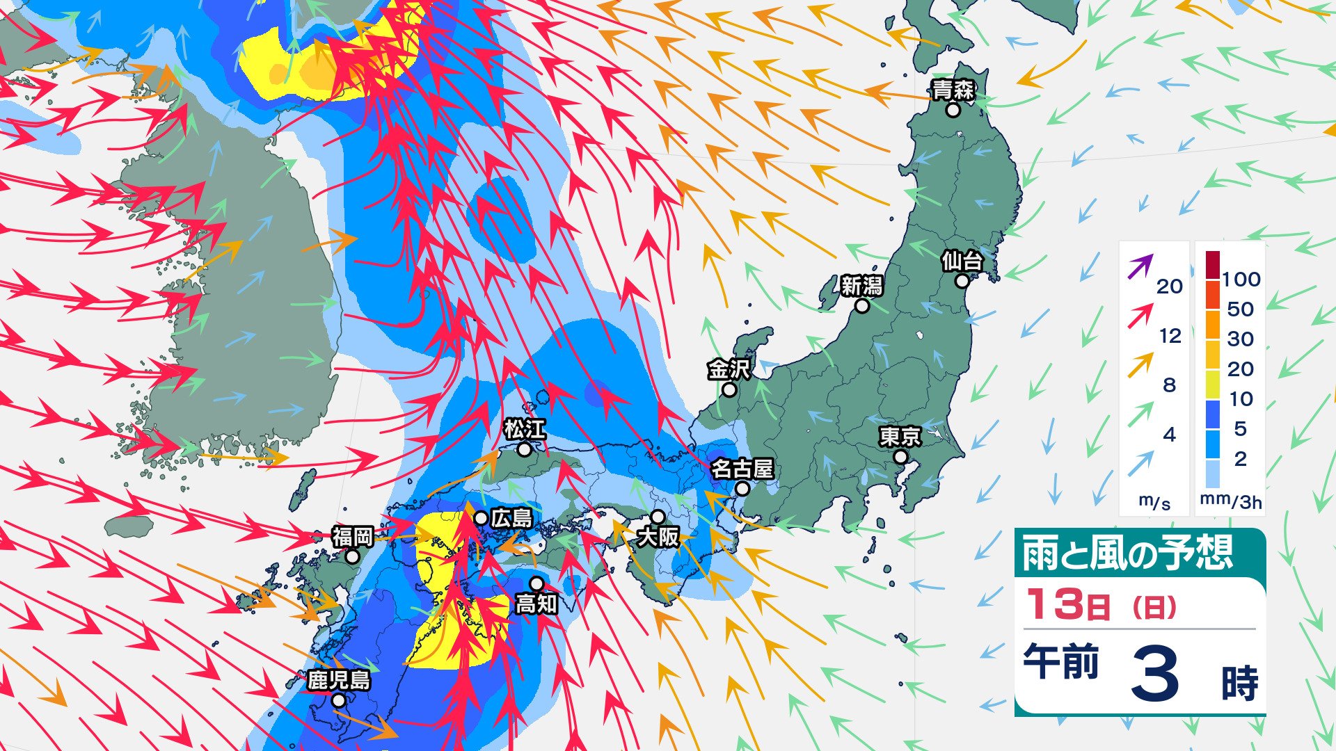 次に3時間ごとの雨と風のシミュレーションを見ていきます。