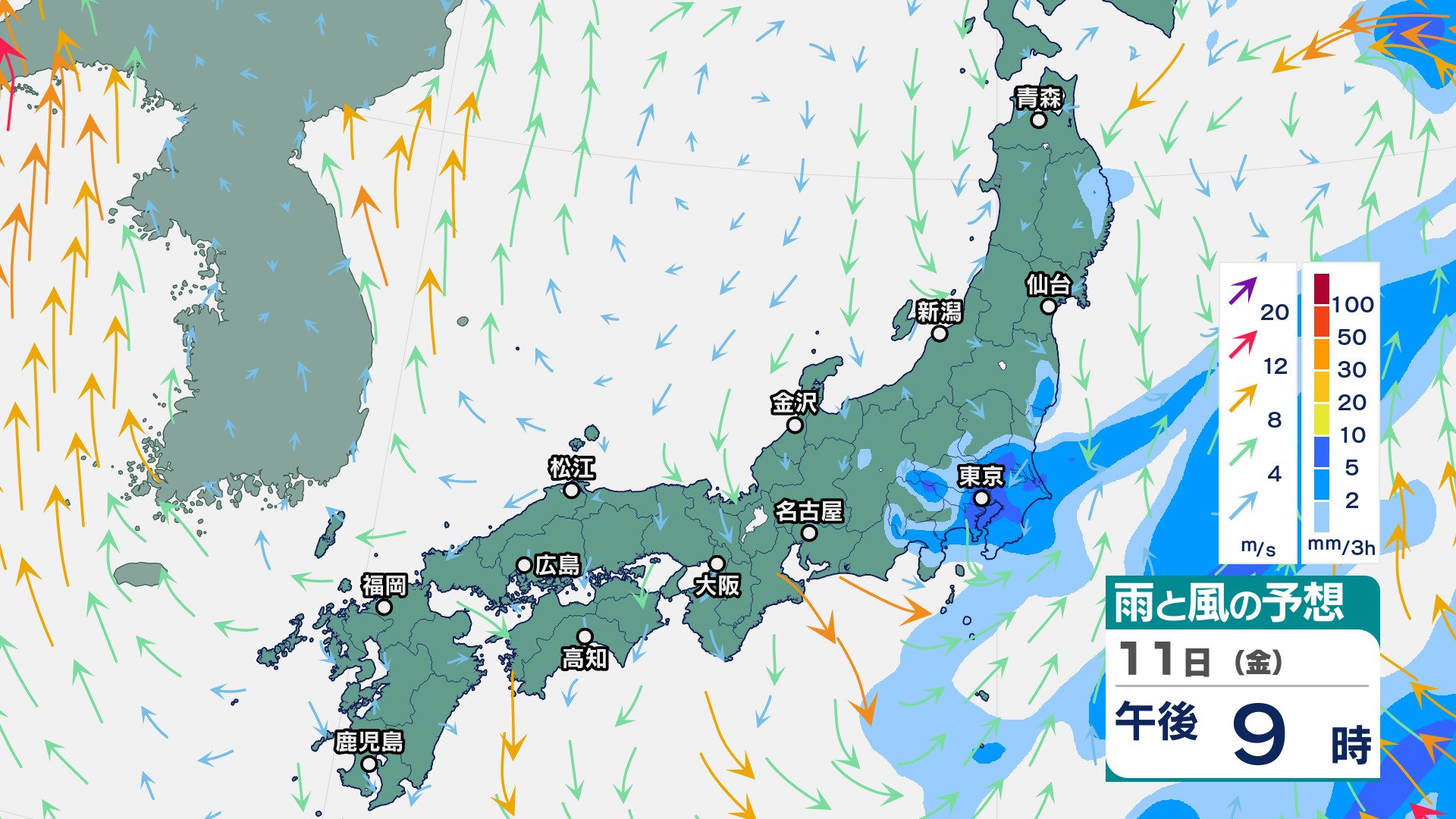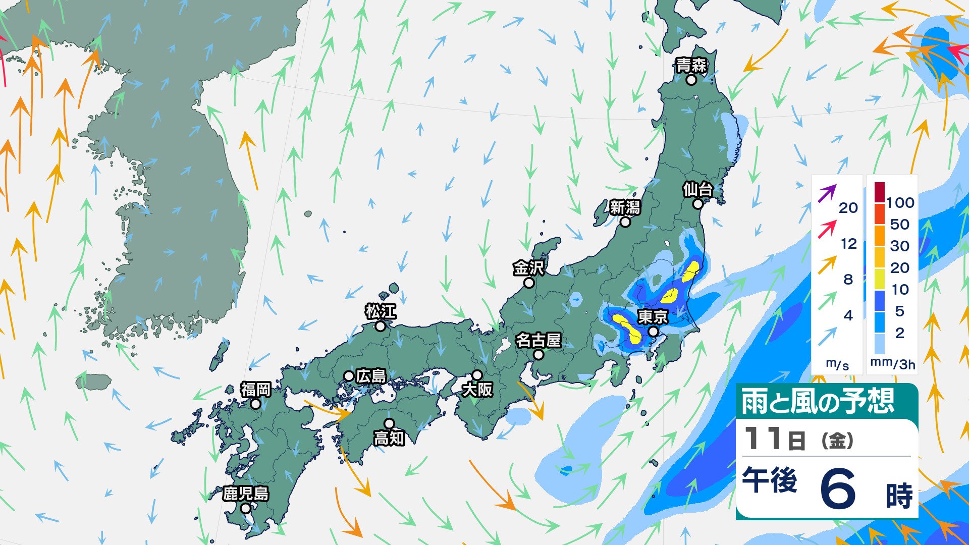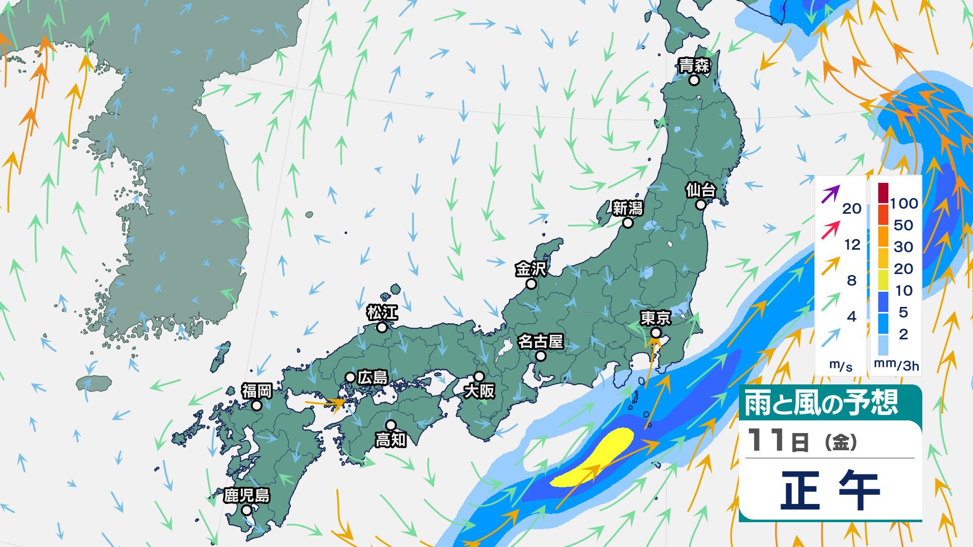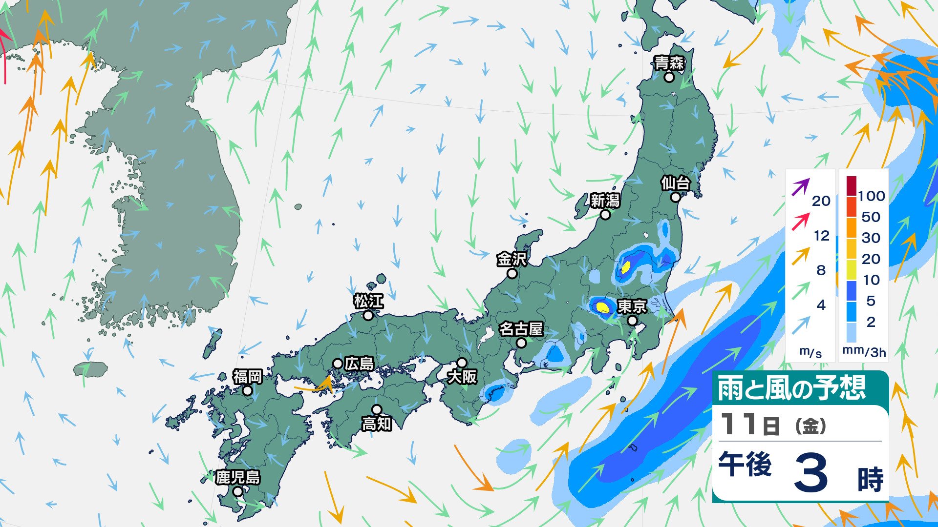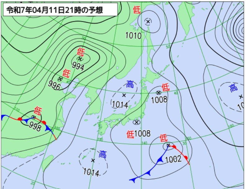 気象庁によりますと日本海を低気圧が東北東に進んでおり、11日昼前にかけて暖かく湿った空気が流れ込むでしょう。また、寒気を伴った上空の気圧の谷が通過する見込みです。このため、北陸地方では大気の非常に不安定な状態が続き、積乱雲が発達する所があるでしょう。