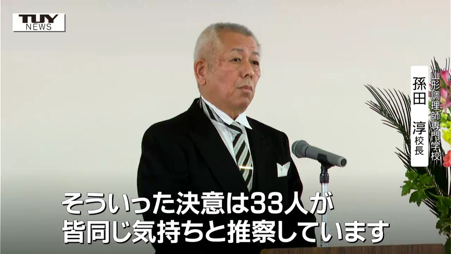 山形調理師専門学校 孫田淳 校長「ここを卒業したあとは調理師の資格をいかして、将来を切り開いていこうと、そういった決意は、ここにいる33名がみな同じ気持ちと推察しています」