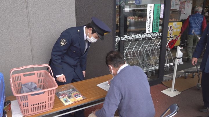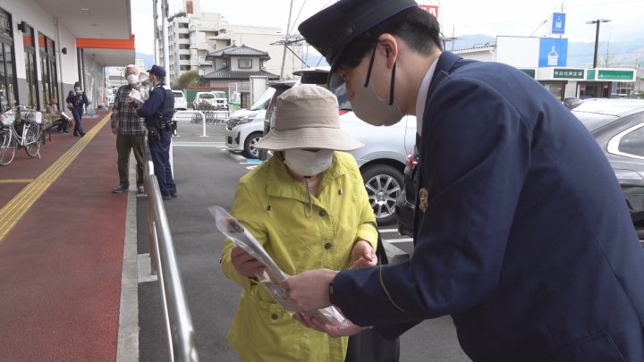 甲府市のスーパーでは、警察官が買い物客に電話詐欺への注意を呼びかけるチラシを配りました。