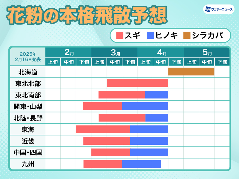 寒気が去っていく2月下旬以降に飛散エリアが拡大、また本格飛散が始まるエリアも拡大するとみています。症状を覚える場合はマスクや目薬で万全の対策をしてください。