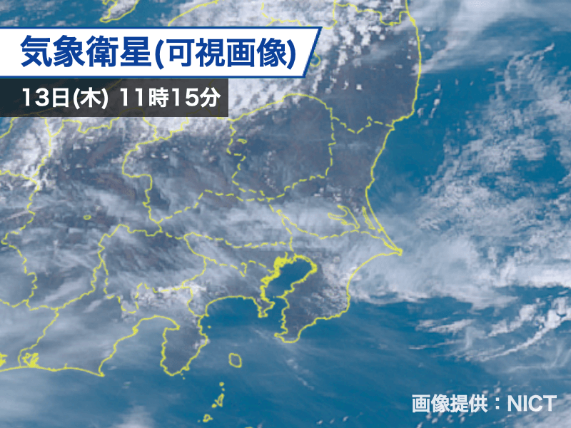 今日13日(木)の関東は少し雲が多く、所々でうっすらとハロが見えています。午後は関東南部を中心に雲が厚くなり、にわか雨が心配です。空模様の変化に注意してください。