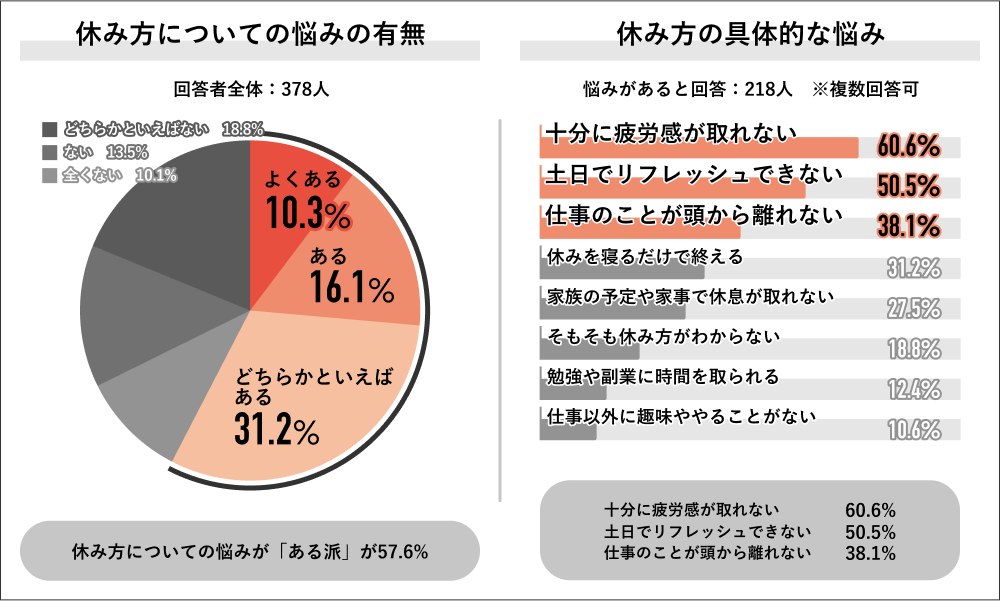 「休み方について悩むことがあるか」と聞くと、「とてもある」10.3%、「ある」16.1%、「どちらかといえばある」31.2%で、計57.6%が「ある」としている。具体的に悩みの内容を聞くと、「十分に疲労感が取れない」60.6%が最多で、「土日でリフレッシュできない」50.5%、「仕事のことが頭から離れない」38.1%が上位だった。