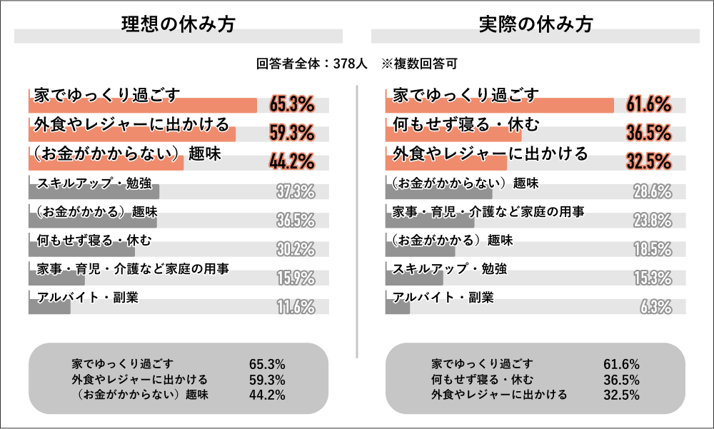 そこで「理想の休み方」「実際の休み方」を聞くと、いずれも「家でゆっくり過ごす」が6割超で最多。2位は違いがあり、理想の休み方2位は「外食やレジャーに出かける」59.3%、実際の休み方2位は「何もせず寝る・休む」36.5%となった。アクティブに過ごしたいが実際は家でノンビリする人が多いようだ。