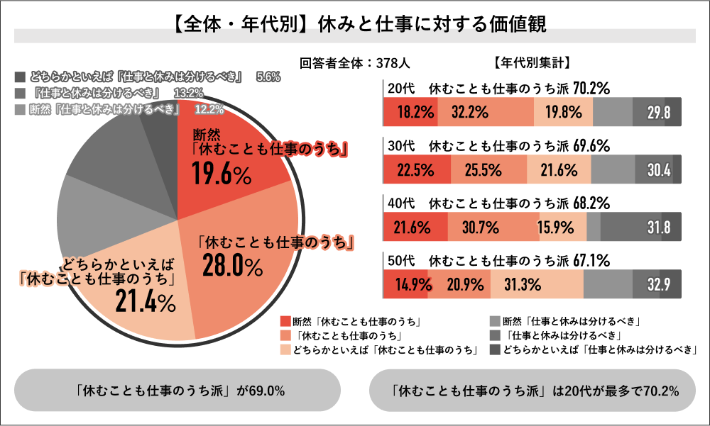 「理想の休み方が及ぼす仕事への影響」を聞くと、9割超が「やる気が高まる」と回答。「休むことも仕事のうちか」と聞くと、7割近くが「そう思う」と回答している。年代別で見ると、「休むことも仕事のうち」と考えているのは20代が70.2%で最多。以下30代69.6%、40代68.2%、50代67.1%となっており、年代が低いほど割合が上がる傾向が見られた。