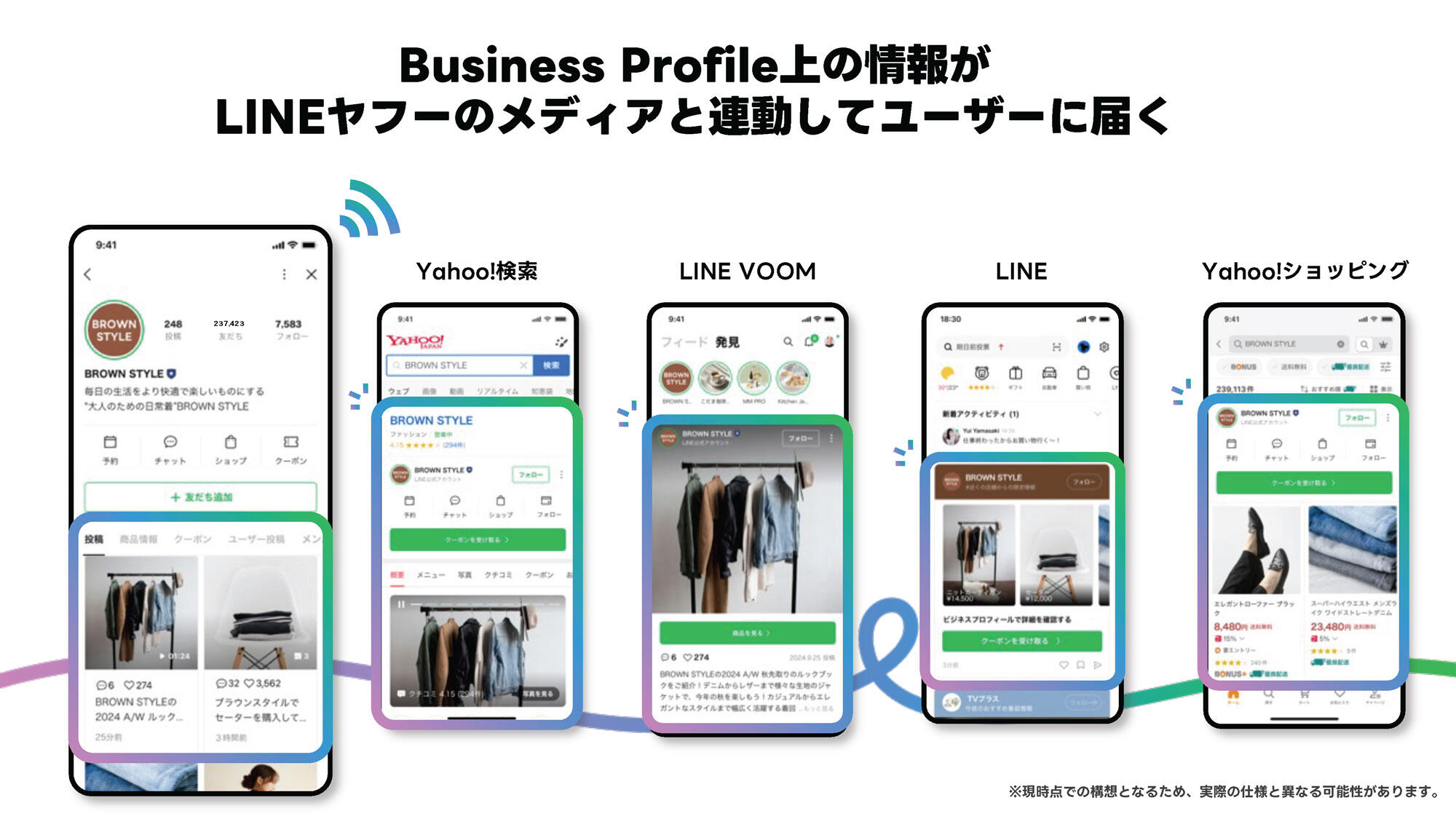 Business Profileでは、ブランド情報、店舗情報、LINE公式アカウントで発信している内容、予約、お問い合わせなどが集約できる。また、LINEヤフー上の各種法人サービスや自社ウェブサイトとも連携が可能となる。