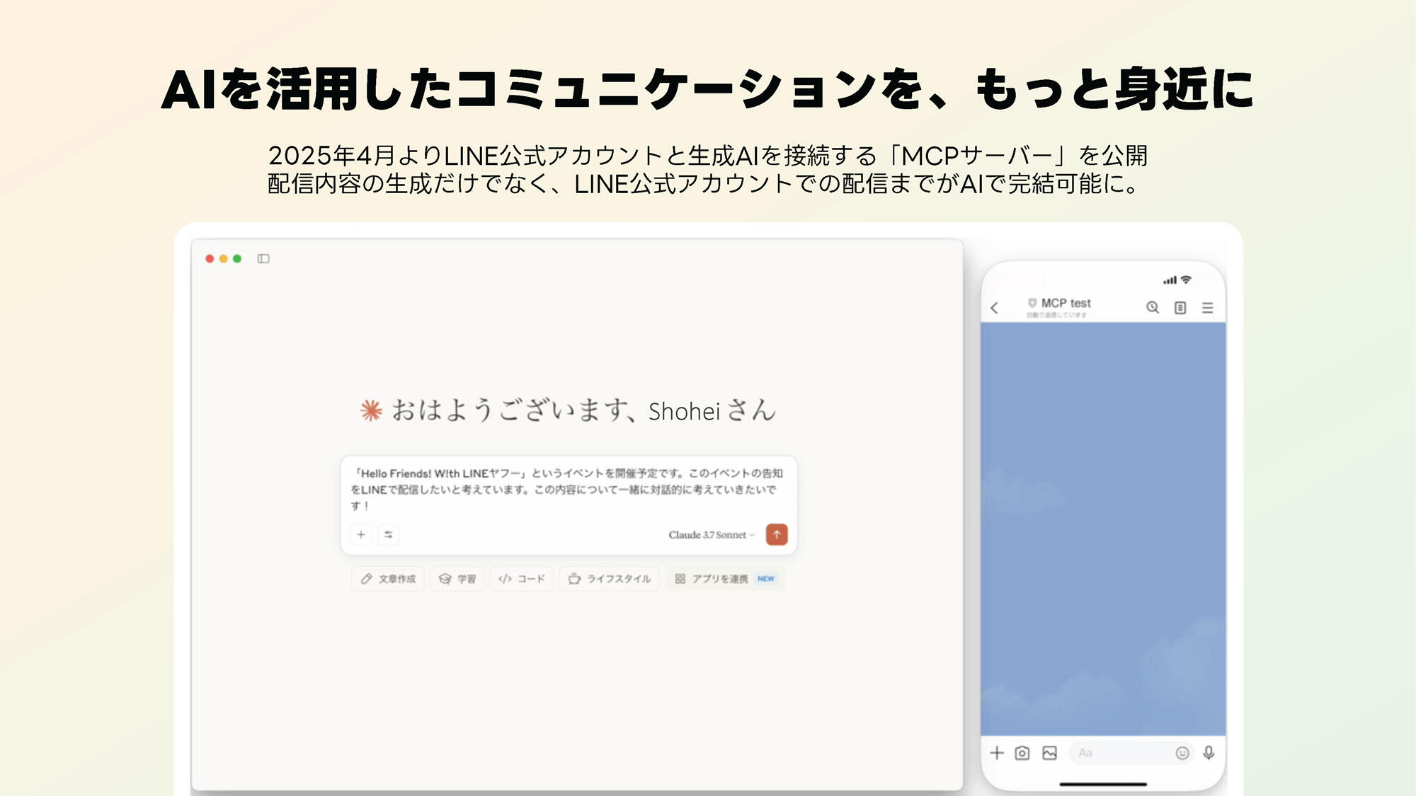 2025年4月からLINE公式アカウントと生成AIを接続する「MCPサーバー」が公開された。これにより、「Claude(クロード)」をはじめとしたさまざまな対話型AI上で、メッセージ作成のサポートや最適なテンプレートの選択、送信などが実現可能となっていく。