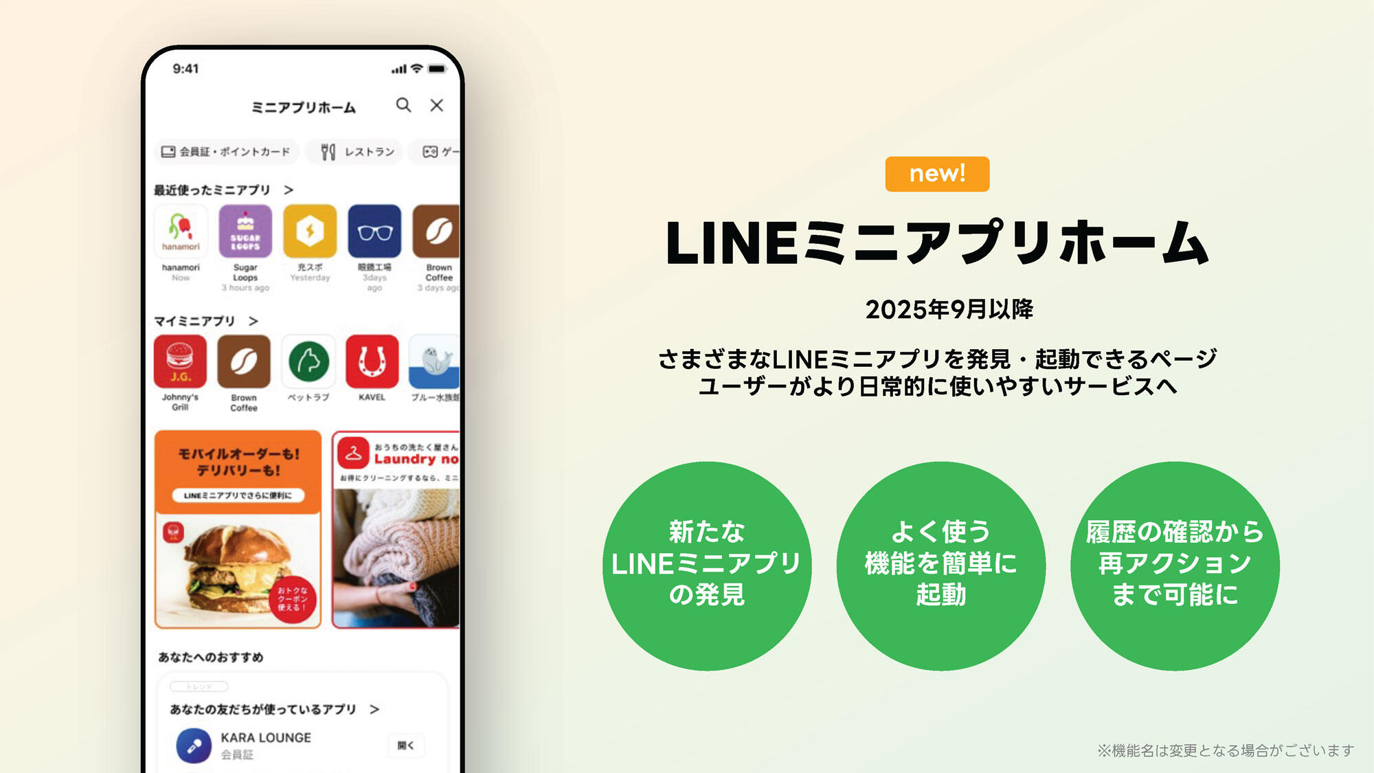 2025年9月以降にリリースされる予定の「LINEミニアプリホーム」は、LINEアプリ内にアプリストアがあるような構造で、LINEミニアプリを探しやすくする機能である。たとえば、過去に利用したLINEミニアプリや人気のLINEミニアプリが閲覧でき、カテゴリー別にLINEミニアプリが表示される。