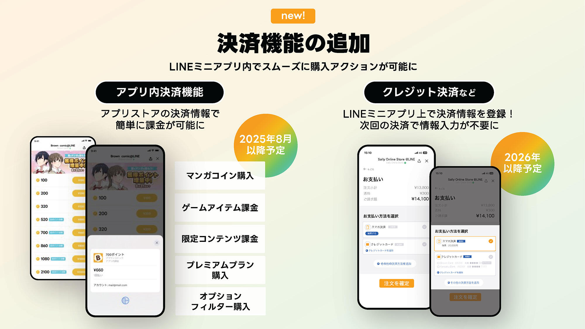 また、LINEミニアプリ内で決済できる機能が2025年8月以降にリリースされる予定であり、さらにクレジット決済も2026年以降に機能搭載される予定だ。