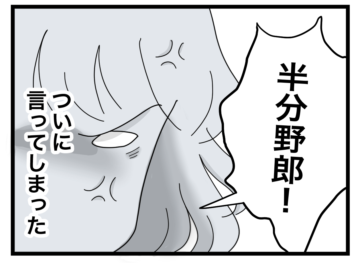 主人公・マチ子は妊娠をきっかけに夫・ブン太と結婚。家事も生活費もきっちり半分にしたいブン太はつわりのせいでやれない家事が増えていくマチ子に不満を漏らすように。マチ子は会社でもつわりに苦しみながら精一杯仕事をこなしてきましたが同僚から厳しい言葉を投げかけられ、やむなく休暇をとることに。さらに病院からは診断書を断られ、傷病手当も申請できない現実に絶望していました。そんな中ブン太から毎月の生活費を催促され、用意できなかったことを責められます。翌日お金を用意して謝ろうとしましたが、今度は準備した食事について不満を言い始めるブン太。栄養面が考えられておらず不公平だと主張するブン太に我慢の限界を迎えたマチ子は「この半分野郎!」とついにブチギレてしまったのでした。