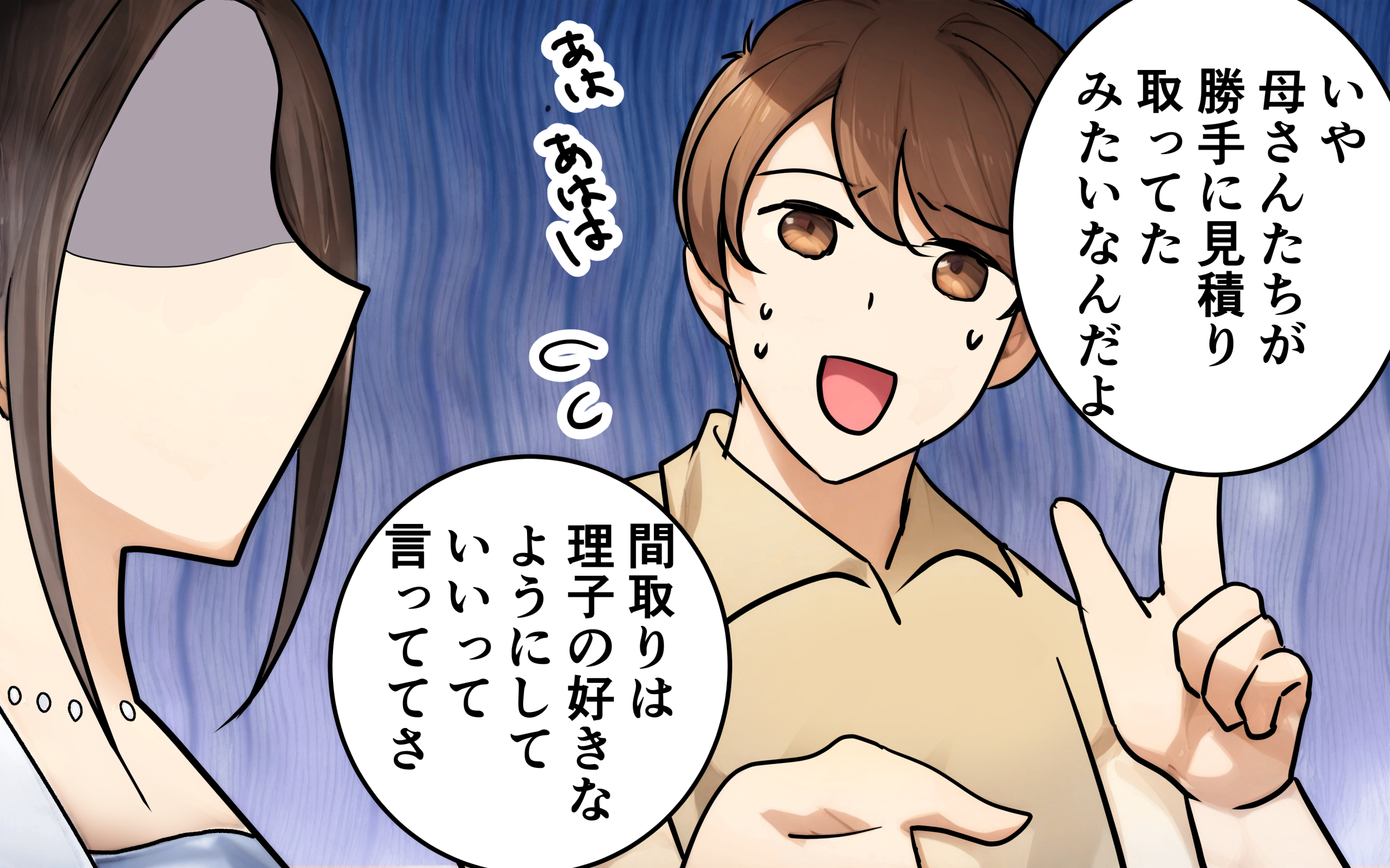 あろうことか、母さんは勝手に二世帯住宅の見積書と間取りを作っていました。共働きの俺たちを助けるために同居して、家事育児を手伝いたいんだそうです。俺はいいけど、理子は…。妻の本音をやんわり話すと、母さんなりに悪かったと反省している様子。
