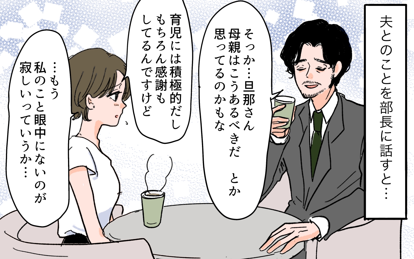 既婚者の森部長には私の夫への不満がわかるのか、うんうんと話を聞いてくれました。それが心地よくて、つい部長の前で夫への愚痴と弱音を吐いてしまった私。すると…。