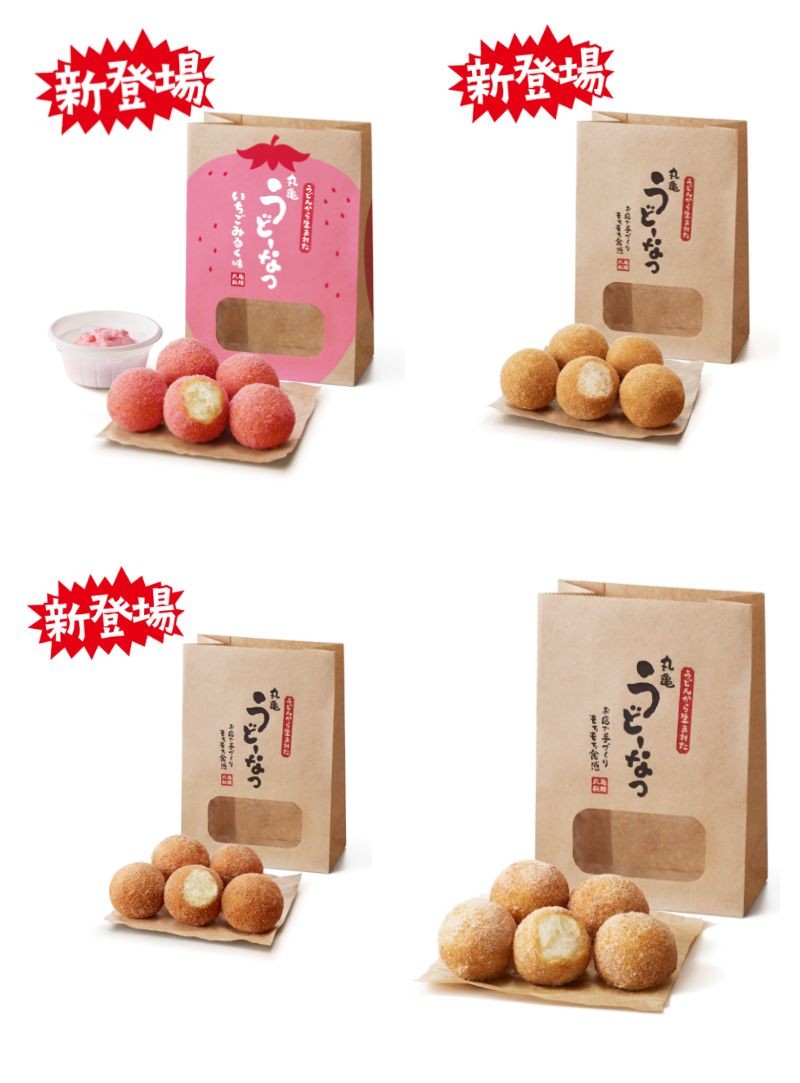 写真左上から時計まわりに:「丸亀うどーなつ いちごみるく味」350円(税込)5個入り、「丸亀うどーなつ きなこ味」「丸亀うどーなつ みたらし味」 「丸亀うどーなつ きび糖味」各300円(税込)5個入り無料配布キャンペーン