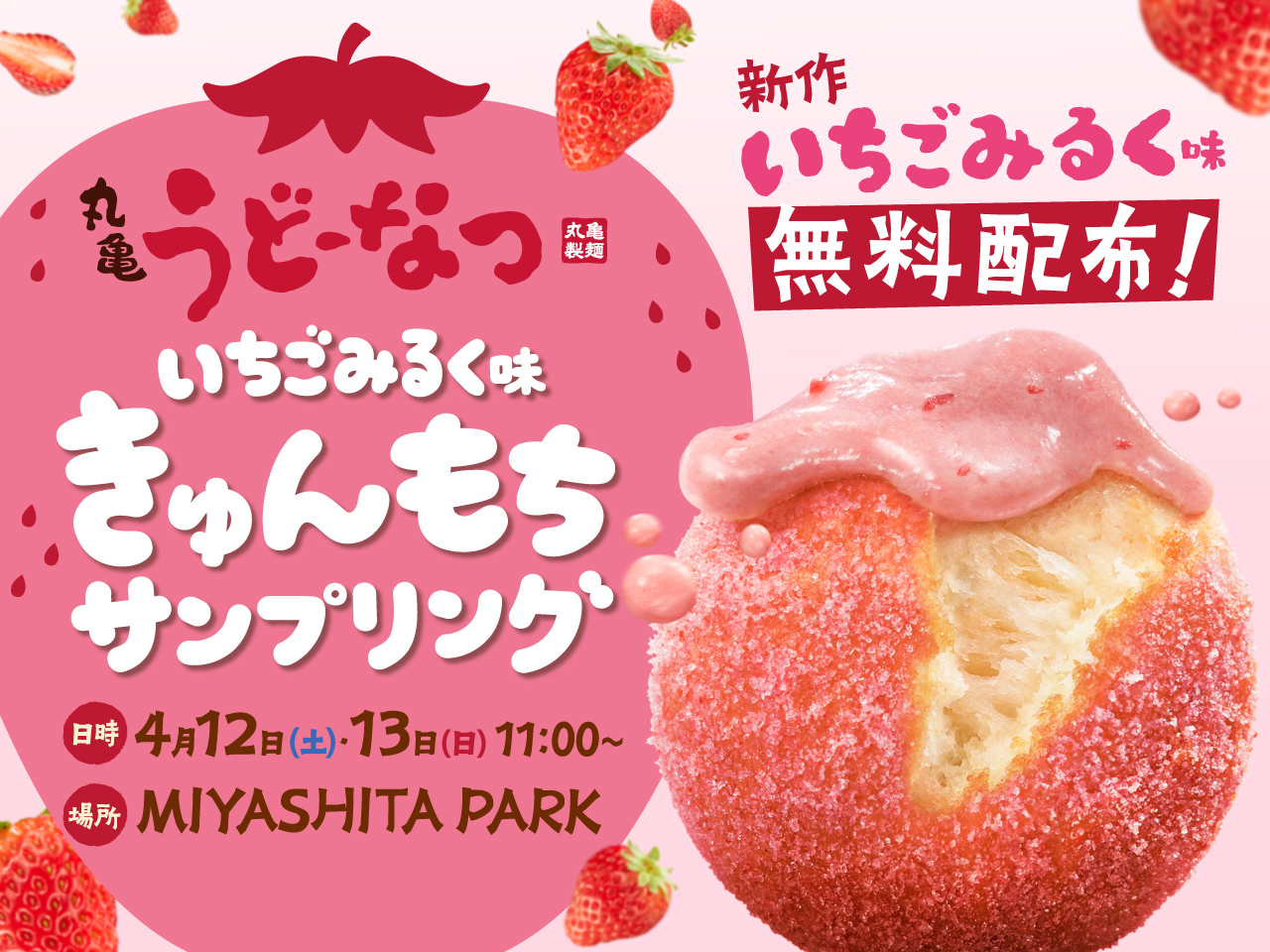 「丸亀うどーなつ きび糖味」以外の3種は4月15日(火)から発売され、なくなり次第終了とのこと。また4月12日(土)、13日(日)には渋谷で「丸亀うどーなつ いちごみるく味」がいち早く試せる、無料配布キャンペーンもあり。ぜひお早めにチェックを!