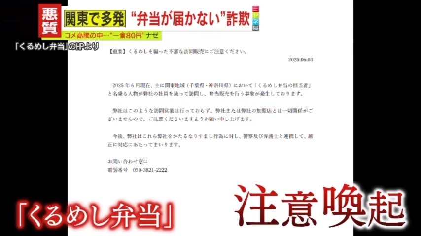 男が名前をあげた『くるめし弁当』は、「弊社は、このような訪問営業は行っておらず、弊社または弊社の加盟店とは一切関係がございませんので、ご注意くださいますようお願い申し上げます」と、ホームページ上で注意喚起。会社としては名前を使われたことに困惑しており、被害が広がらないよう対応を協議しているといいます。
