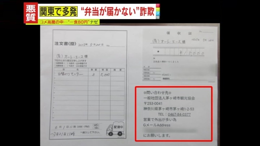 実際、注文書には、『茅ヶ崎市観光協会』の名前と連絡先が記載されていました。弁当配達との関連について、茅ヶ崎市観光協会・大八木和也事務局長は、「茅ヶ崎市観光協会は関わっていない。2025年6月4日までで、18件ほど問い合わせの電話を頂いている。自動車関係の工場などの方が多いようだ」と話しています。