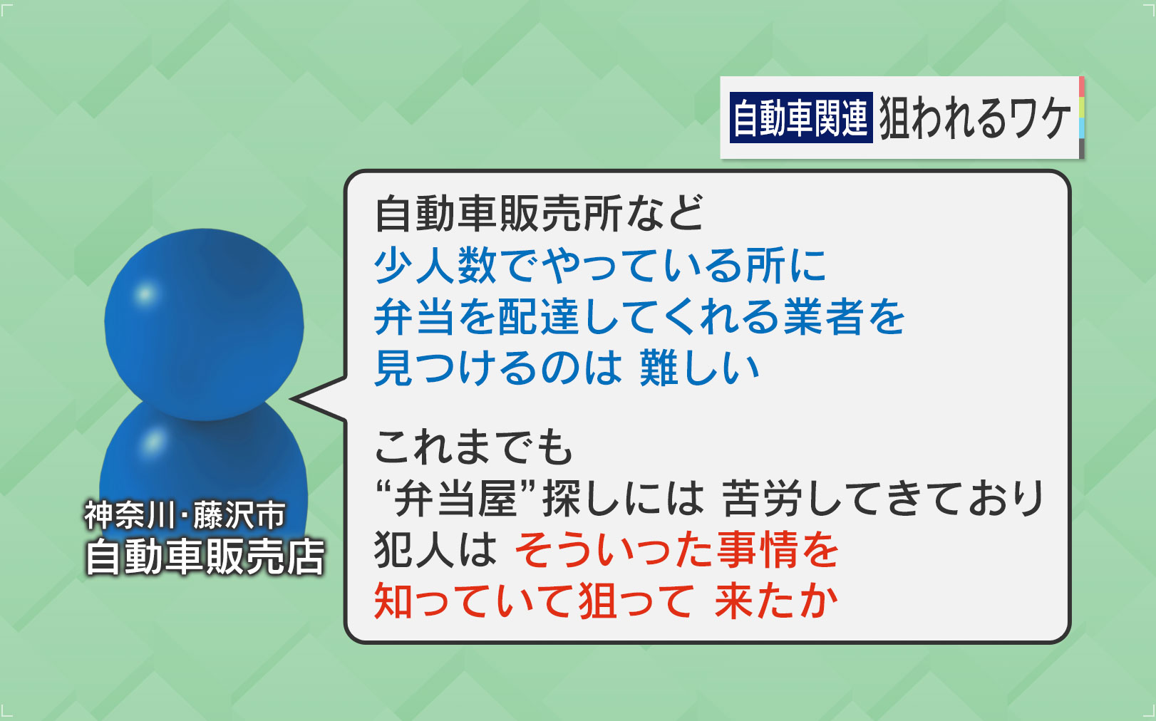 広範囲にわたる被害ですが、とりわけ自動車販売店が多く狙われています。被害を受けた神奈川・藤沢市の自動車販売店は、「自動車販売所など、少人数でやっている所に弁当を配達してくれる業者を見つけるのは難しい。これまでも“弁当屋”探しには苦労してきており、犯人はそういった事情を知っていて狙って来たか」と推測しています。